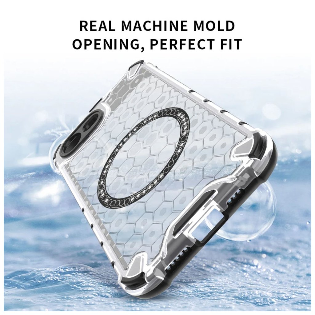 Kryt Techsuit HoneyComb Shield MagSafe sa pýši transparentným zadným panelom s unikátnym voštinovým (honeycomb) vzorom, ktorý nielen skvele vyzerá, ale aj prispieva k lepšej absorpcii nárazov. Dominantným prvkom je integrovaný MagSafe krúžok, elegantne ohraničený drobnými bodkami, ktorý zaisťuje perfektnú kompatibilitu s MagSafe príslušenstvom a bezdrôtovým nabíjaním.