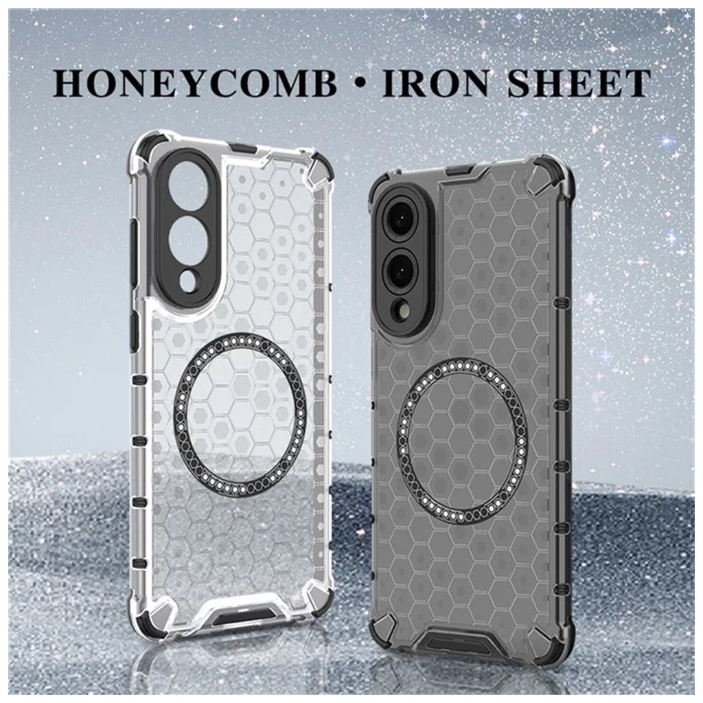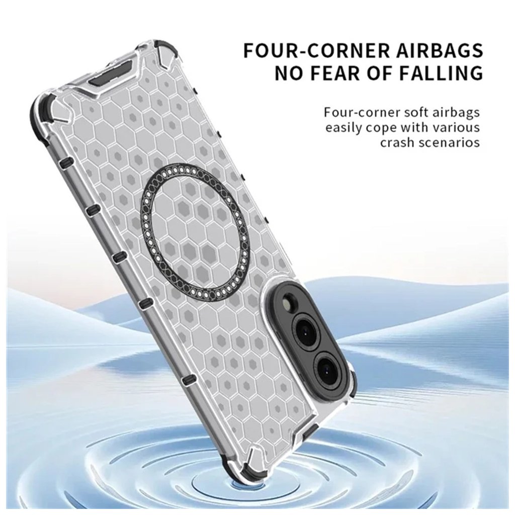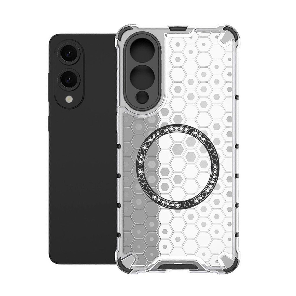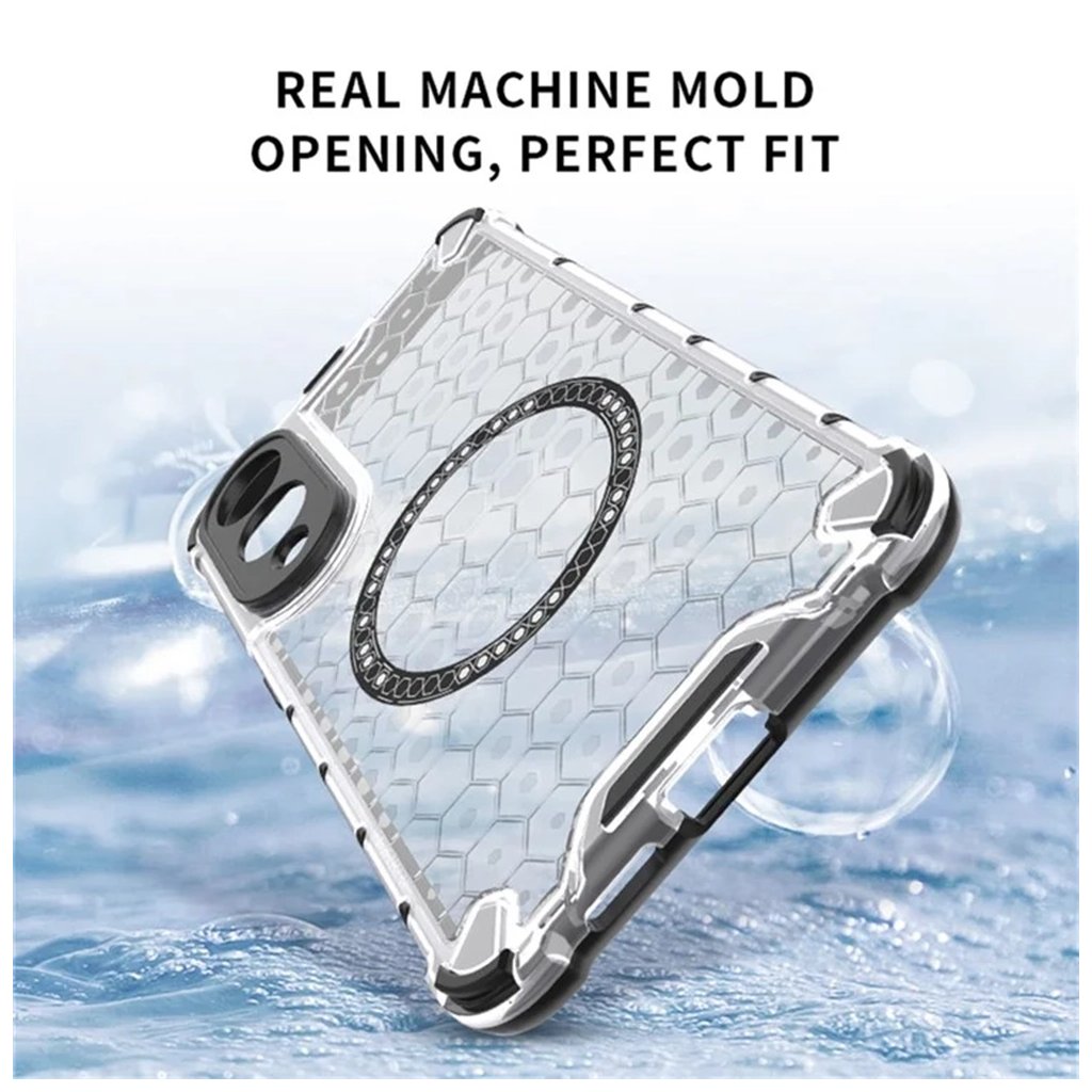 Puzdro Techsuit HoneyComb Shield MagSafe v bielej farbe je navrhnuté tak, aby poskytovalo maximálnu ochranu a zároveň podtrhlo elegantný vzhľad vášho telefónu. Zadná strana puzdra je transparentná s výrazným voštinovým (honeycomb) vzorom, ktorý dodáva moderný a dynamický vzhľad. Integrovaný MagSafe krúžok v čiernej farbe s drobnými bielymi detailmi zaisťuje perfektnú kompatibilitu s MagSafe príslušenstvom a zároveň je štýlovým prvkom dizajnu. Rohy puzdra sú zosilnené, čo efektívne absorbuje nárazy a chráni telefón pred poškodením pri pádoch. Oblasť okolo fotoaparátu je rovnako robustne chránená čiernym rámčekom, ktorý zabraňuje poškriabaniu šošoviek.