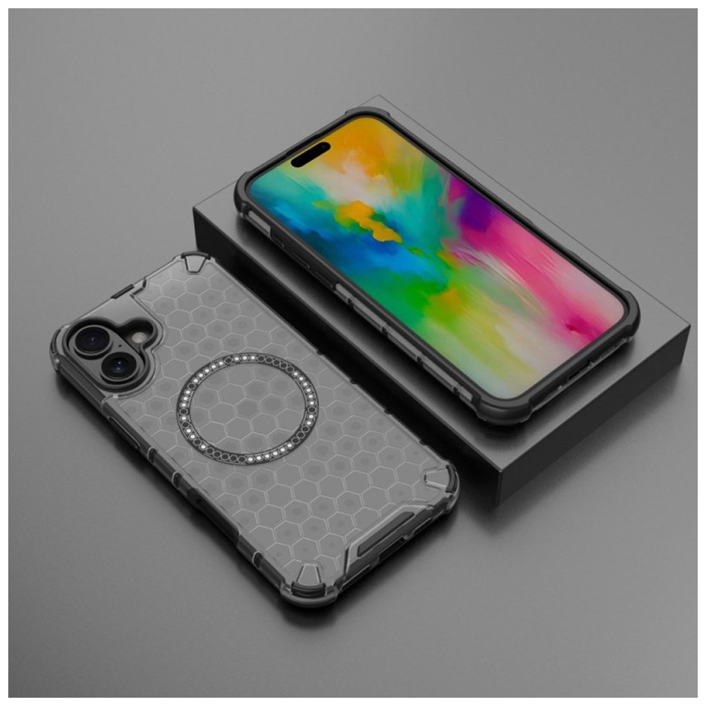 Puzdro Techsuit HoneyComb Shield MagSafe pre iPhone 16 sa pýši moderným a funkčným dizajnom. Jeho transparentné prevedenie s výrazným voštinovým vzorom na zadnej strane dodáva telefónu elegantný vzhľad a zároveň zaisťuje optimálne rozloženie nárazovej energie pri páde.