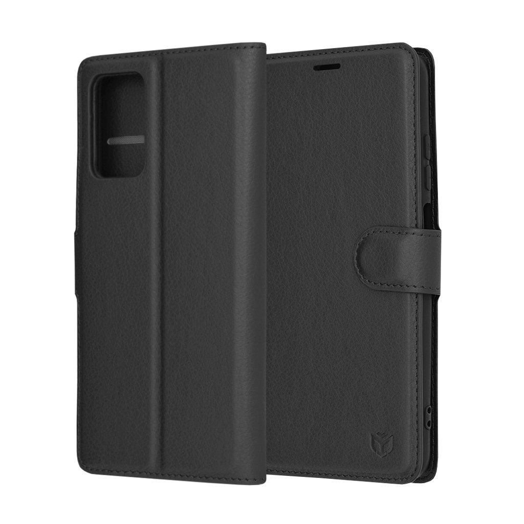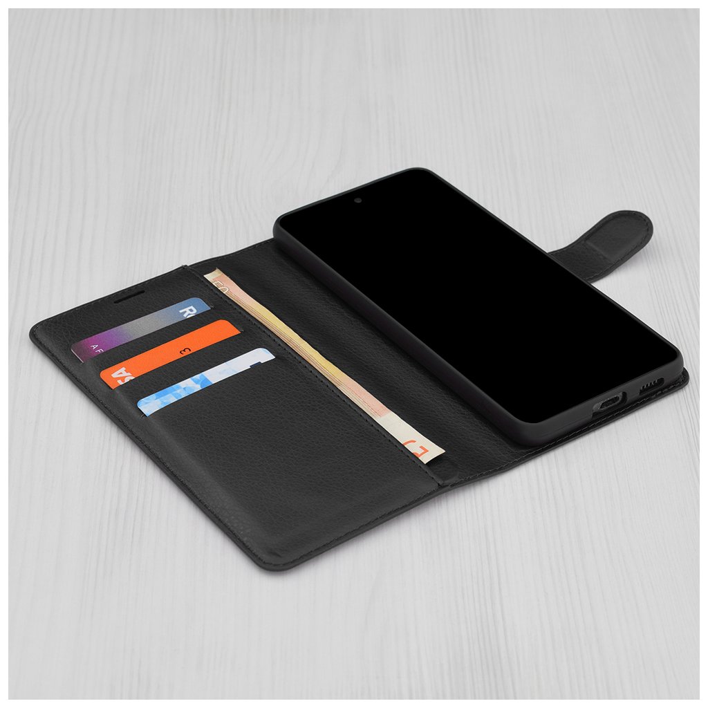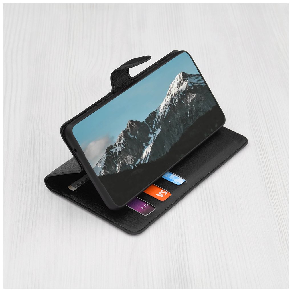 Puzdro sa pýši luxusným koženým vzhľadom s jemnou textúrou, ktorá je príjemná na dotyk a zároveň zaisťuje pevný úchop. Jeho čierna farba dodáva telefónu nadčasovú eleganciu a profesionálny vzhľad. Dizajn typu "folio" chráni ako zadnú stranu, tak aj displej telefónu, čo minimalizuje riziko poškodenia pri pádoch či poškriabaní.