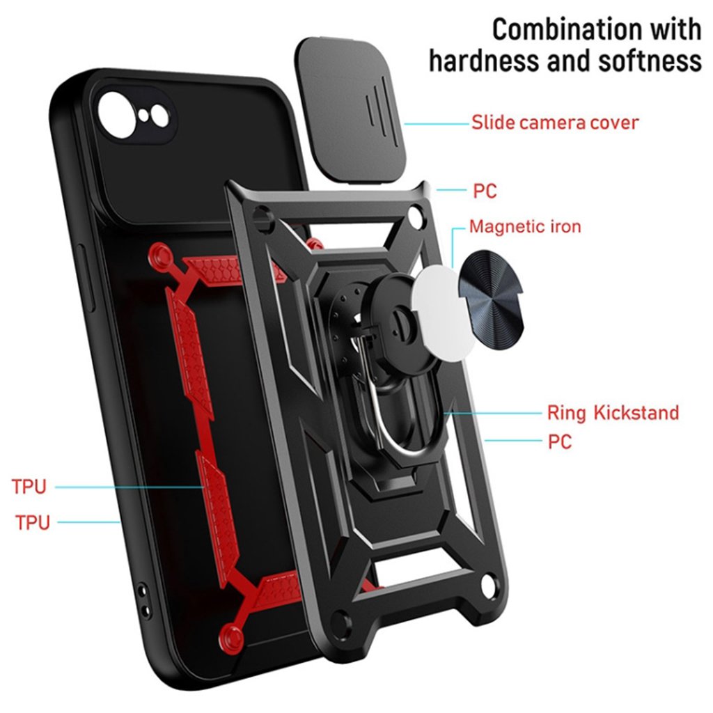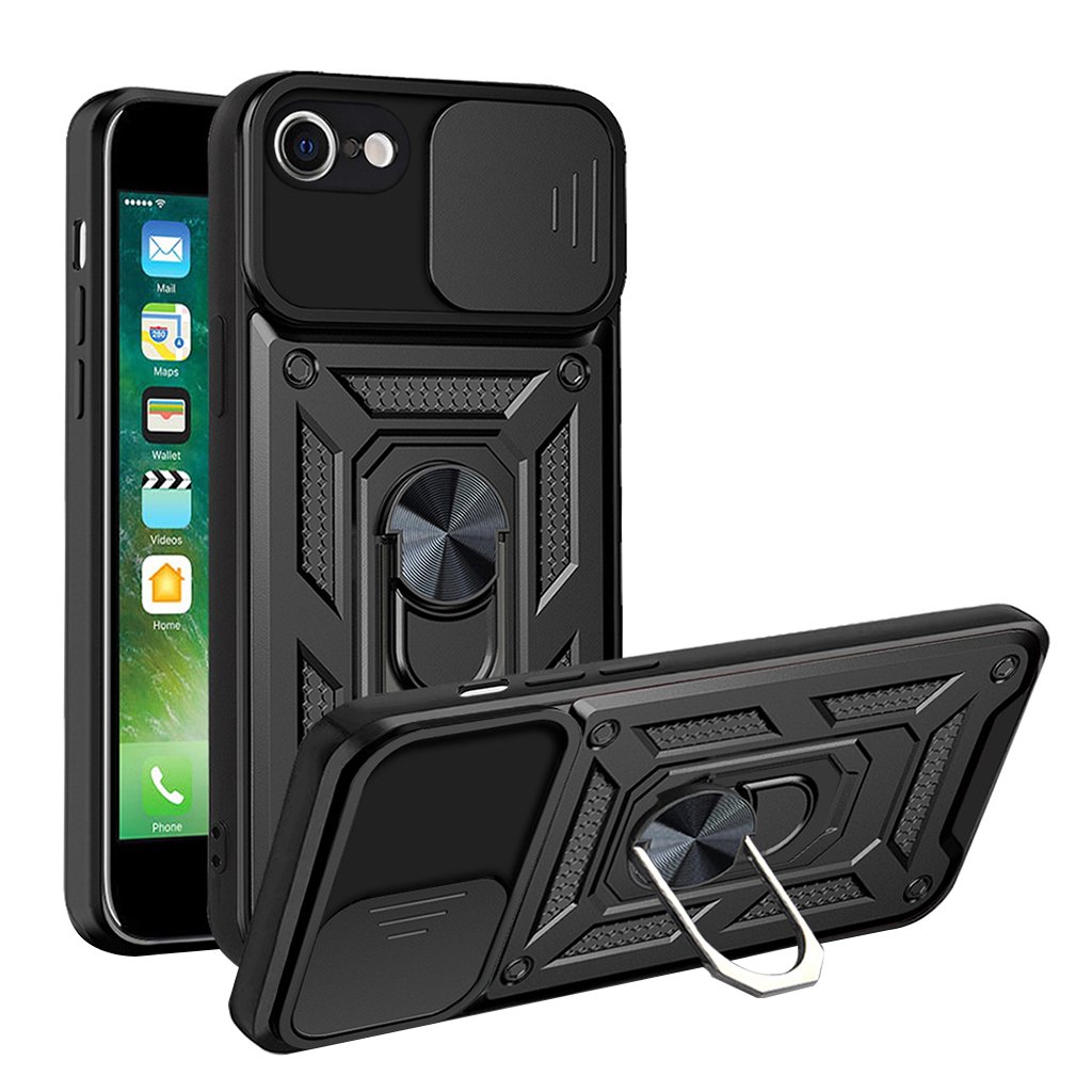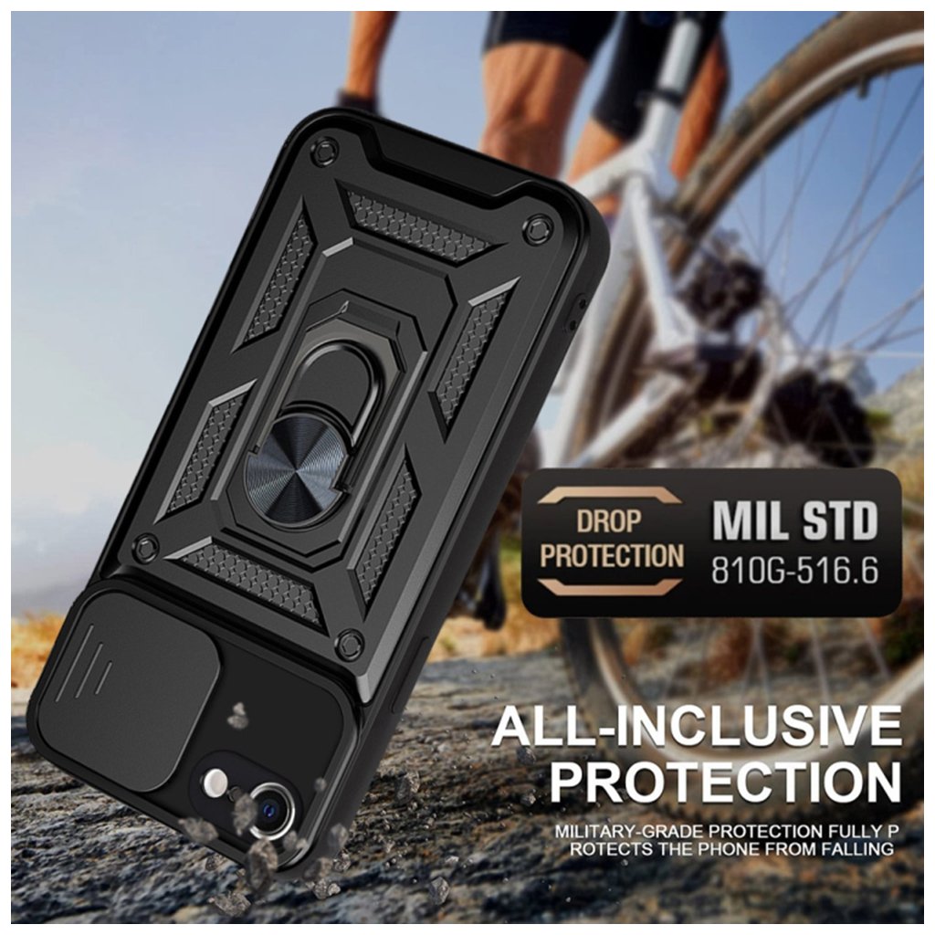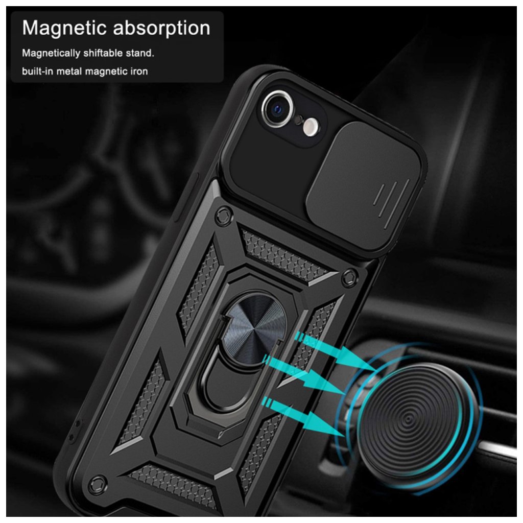 Techsuit Kryt CamShield iPhone 7 8 SE 2 2020 SE 3 2022 Čierny Techsuit CamShield kryt pre iPhone 7 / 8 / SE 2020 / SE 2022 – čierny Predstavujeme Techsuit CamShield kryt v elegantnej čiernej farbe, ktorý je navrhnutý tak, aby poskytoval komplexnú ochranu vášmu iPhonu a zároveň ponúkal rad praktických funkcií. Tento kryt je ideálnou voľbou pre tých, ktorí hľadajú prvotriedne zabezpečenie svojho zariadenia za rozumnú cenu. Dizajn a parametre Kryt Techsuit CamShield sa pýši robustným a funkčným dizajnom, ktorý kombinuje estetiku s maximálnou ochranou. Jeho zadná strana je opatrená textúrovaným povrchom, ktorý zlepšuje úchop a dodáva krytu moderný, taktický vzhľad. Kľúčovou vlastnosťou je integrovaný posuvný kryt fotoaparátu (CamShield), ktorý efektívne chráni šošovky pred poškriabaním, prachom a zároveň zaisťuje vaše súkromie. Uprostred zadnej strany sa nachádza kovový prstenec, ktorý slúži ako otočný stojan o 360° pre pohodlné sledovanie videí alebo videohovory. Tento prstenec zároveň poskytuje bezpečnejší úchop telefónu a vďaka integrovanému kovovému prvku je kompatibilný s magnetickými držiakmi do auta. Kryt je vyrobený z kombinácie tvrdého polykarbonátu (PC) a mäkkého termoplastického polyuretánu (TPU), čo zaručuje vysokú odolnosť proti nárazom a pádom, spĺňajúci štandard MIL STD 810G-516.6 pre ochranu proti pádu. Značka Techsuit: Kvalita, na ktorú sa môžete spoľahnúť Značka Techsuit predstavuje inteligentné riešenie pre každého, kto vyžaduje prvotriednu ochranu za rozumnú cenu. Prečo je Techsuit tou správnou voľbou pre vaše zariadenie?- Európsky štandard kvality a materiálov: Na rozdiel od bezejmenných krytov s pochybným pôvodom sú produkty Techsuit vyrobené z starostlivo vybraných a zdravotne nezávadných materiálov. To zaručuje nielen dlhú životnosť a odolnosť proti každodennému opotrebovaniu, ale aj bezpečie pre vás a vaše okolie.