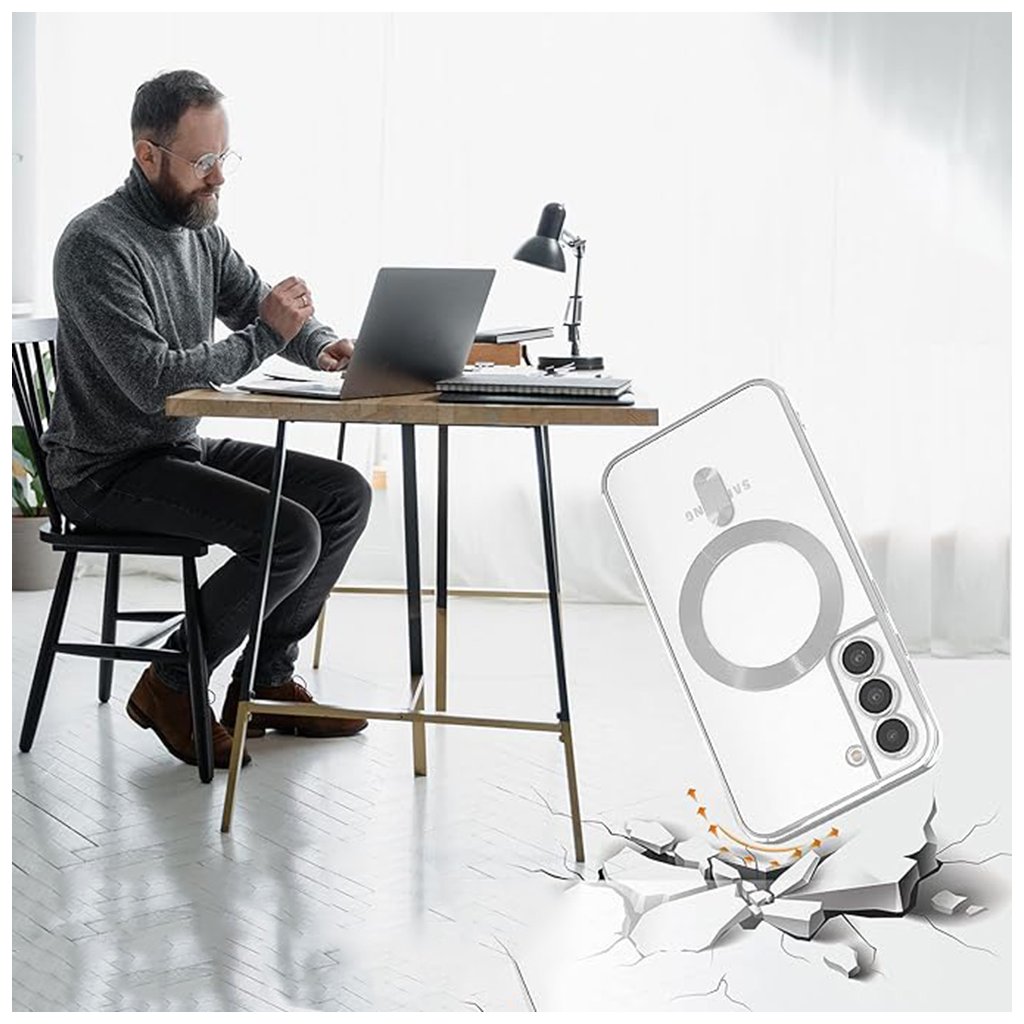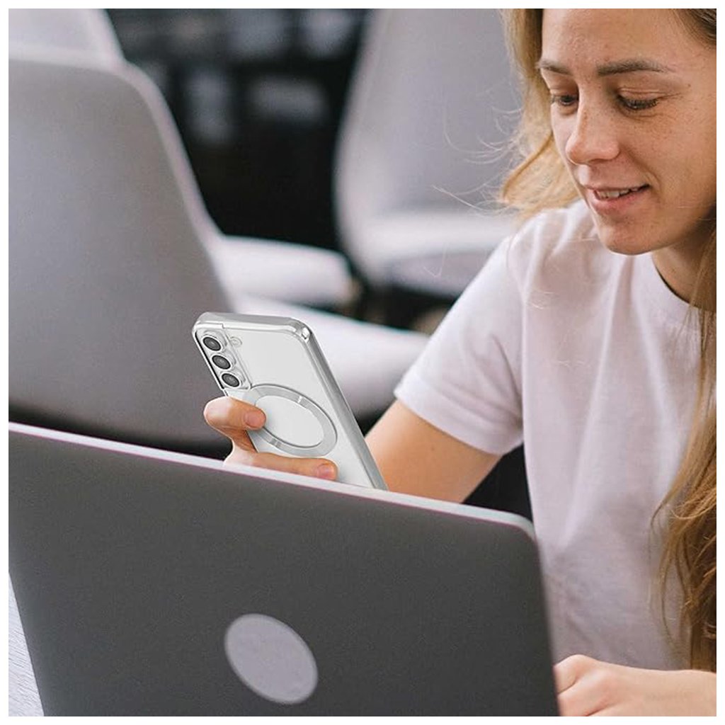 Puzdro sa pýši transparentným zadným panelom, ktorý nechá vyniknúť originálnu krásu vášho telefónu Samsung Galaxy S21 Plus 5G. Elegantné svetlozelené akcenty lemujú okraje krytu a precízne obopínajú modul fotoaparátu, čím dodávajú celkovému vzhľadu moderný a svieži nádych. Dominantným prvkom je integrovaný MagSafe krúžok v rovnakej svetlozelenej farbe, ktorý zaisťuje perfektnú kompatibilitu s MagSafe príslušenstvom a bezdrôtovým nabíjaním. Dizajn je doplnený o vertikálny svetlozelený prvok pod MagSafe krúžkom, ktorý podčiarkuje celkovú estetiku a funkčnosť.