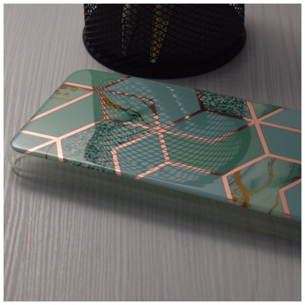 Puzdro sa pýši moderným geometrickým vzorom, ktorý je tvorený šesťuholníkmi a ďalšími polygonálnymi tvarmi. Tieto tvary sú ohraničené jemnými linkami vo farbe ružového zlata, ktoré dodávajú celkovému vzhľadu luxusný nádych. Vzory vo vnútri jednotlivých segmentov sa striedajú – niektoré imitujú svieži zelený mramor s elegantnými zlatými žilkami, zatiaľ čo iné sú vyplnené trblietavými zelenými glitrami, ktoré dodávajú puzdru iskru a dynamiku. Celková farebná paleta sa pohybuje v odtieňoch svetlozelenej a tyrkysovej, čo vytvára harmonický a pútavý celok. Puzdro je vyrobené z kvalitných a odolných materiálov, ktoré zaisťujú dlhú životnosť a spoľahlivú ochranu.
