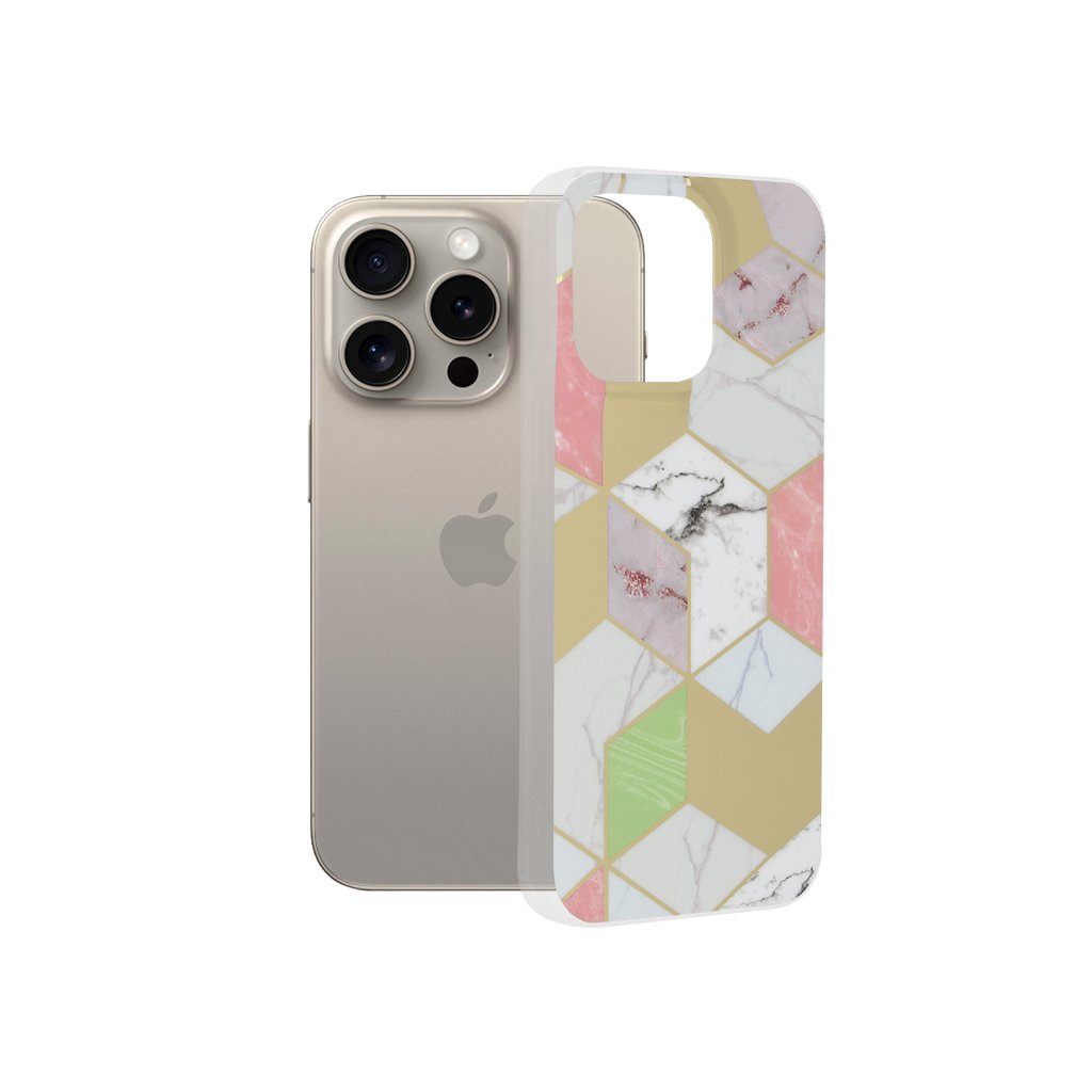 Puzdro Techsuit Marble Series vo vyhotovení Fialový Hex sa pýši moderným geometrickým dizajnom, ktorý kombinuje elegantné mramorové textúry s výraznými šesťuholníkovými prvkami. Vzor je tvorený harmonickou paletou farieb, kde sa prelínajú odtiene bielej, ružovej, jemne zelenej a zlatej, vytvárajúc tak luxusný a pútavý vzhľad. Priehľadné okraje puzdra navyše nechávajú vyniknúť originálnu farbu vášho telefónu, zatiaľ čo precízne spracovanie zaisťuje, že dizajn dokonale ladí s krivkami iPhone 15 Pro Max.