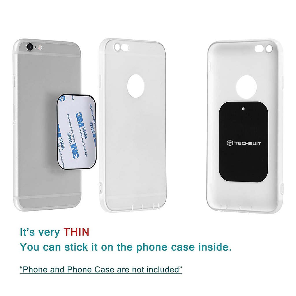 Sada Techsuit MP04 obsahuje štyri kovové doštičky v modernom matnom čiernom prevedení, ktoré sa diskrétne začlenia do dizajnu vášho zariadenia. Dve doštičky sú obdĺžnikového tvaru so zaoblenými rohmi a dve sú kruhové, čo poskytuje flexibilitu pri výbere ideálneho umiestnenia. Každá doštička je opatrená decentným bielym logom značky Techsuit, ktoré podčiarkuje jej kvalitu. Ich extrémne tenký profil, ktorý je až trikrát tenší ako bežná kreditná karta, zaručuje, že doštičky nebudú prekážať a ľahko sa zmestia pod kryt telefónu alebo priamo naň.