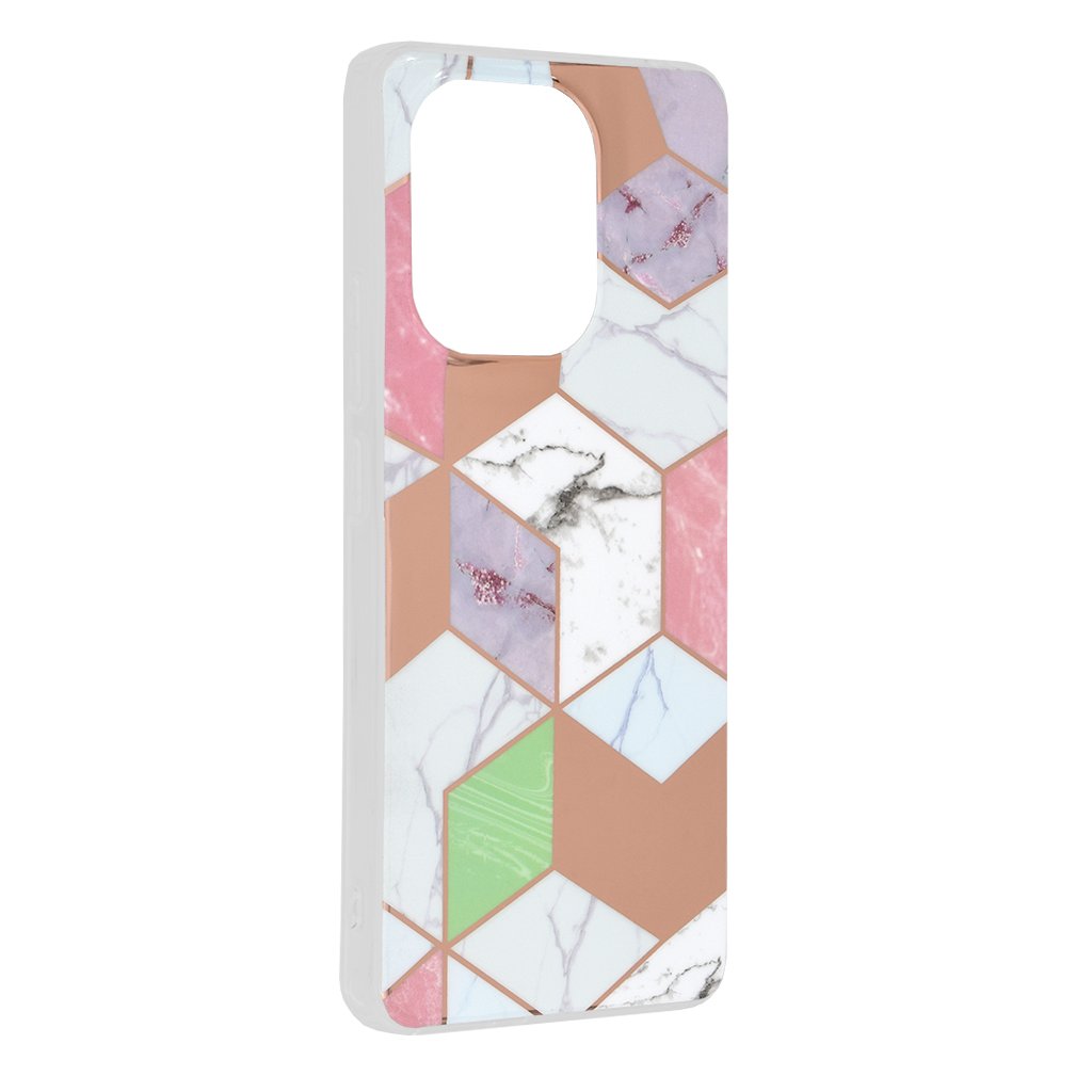 Puzdro sa pýši moderným geometrickým dizajnom tvoreným šesťuholníkmi, ktoré vytvárajú trojrozmerný efekt. Vzory imitujúce luxusný mramor v odtieňoch bielej so sivým žilkovaním, jemnej ružovej, svetlofialovej s decentnými trblietavými akcentmi a nádychom sviežej zelenej sa snúbia s elegantnými líniami vo farbe ružového zlata. Tieto metalické prvky dodávajú puzdru sofistikovaný vzhľad a podčiarkujú jeho jedinečnosť. Okraje puzdra sú priehľadné, čo necháva vyniknúť pôvodnú farbu vášho telefónu a zároveň zaisťuje komplexnú ochranu.