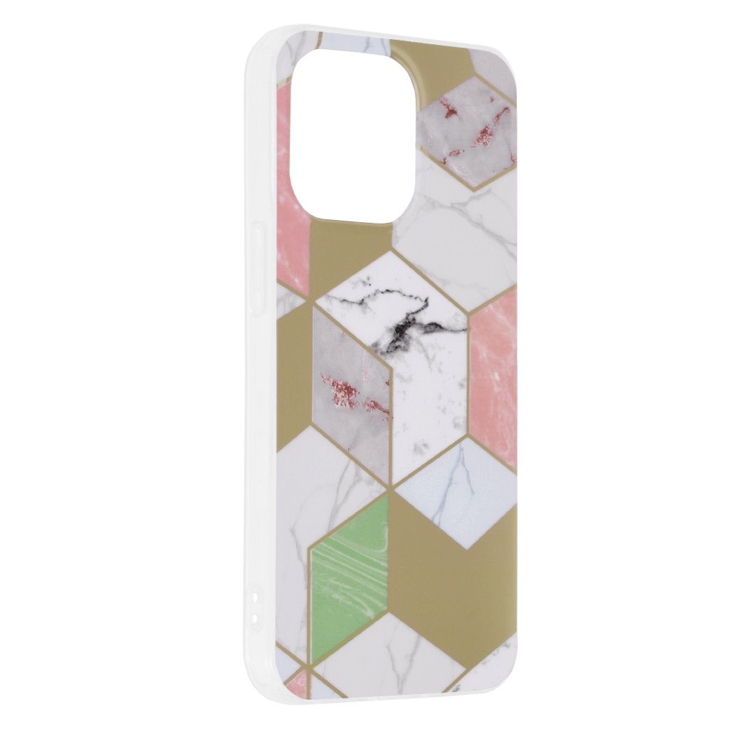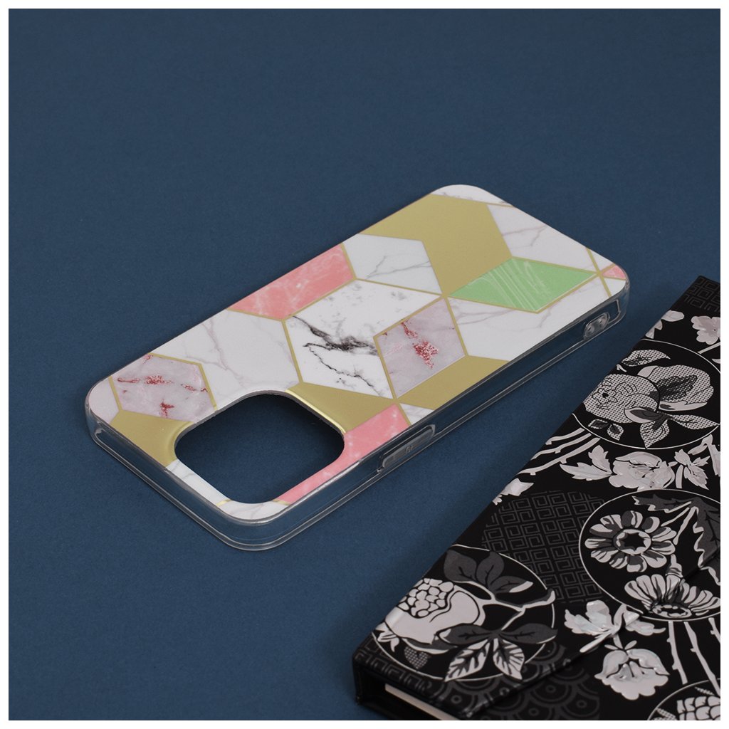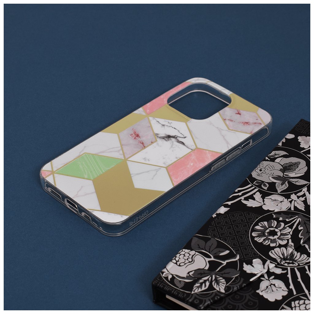 Dizajn puzdra "Fialový hex" zaujme na prvý pohľad. Zadná strana je zdobená moderným geometrickým vzorom zloženým z hexagonov. Tieto šesťuholníky sa striedajú v elegantných odtieňoch: niektoré sú v luxusnej zlatej farbe, iné imitujú biely mramor s jemnými sivými a čiernymi žilkami, ďalšie potom svetloružový mramor s nádychom červených akcentov a nechýba ani svieži svetlozelený mramor. Celkový vzhľad je sofistikovaný a dodá vášmu telefónu osobitý šarm.