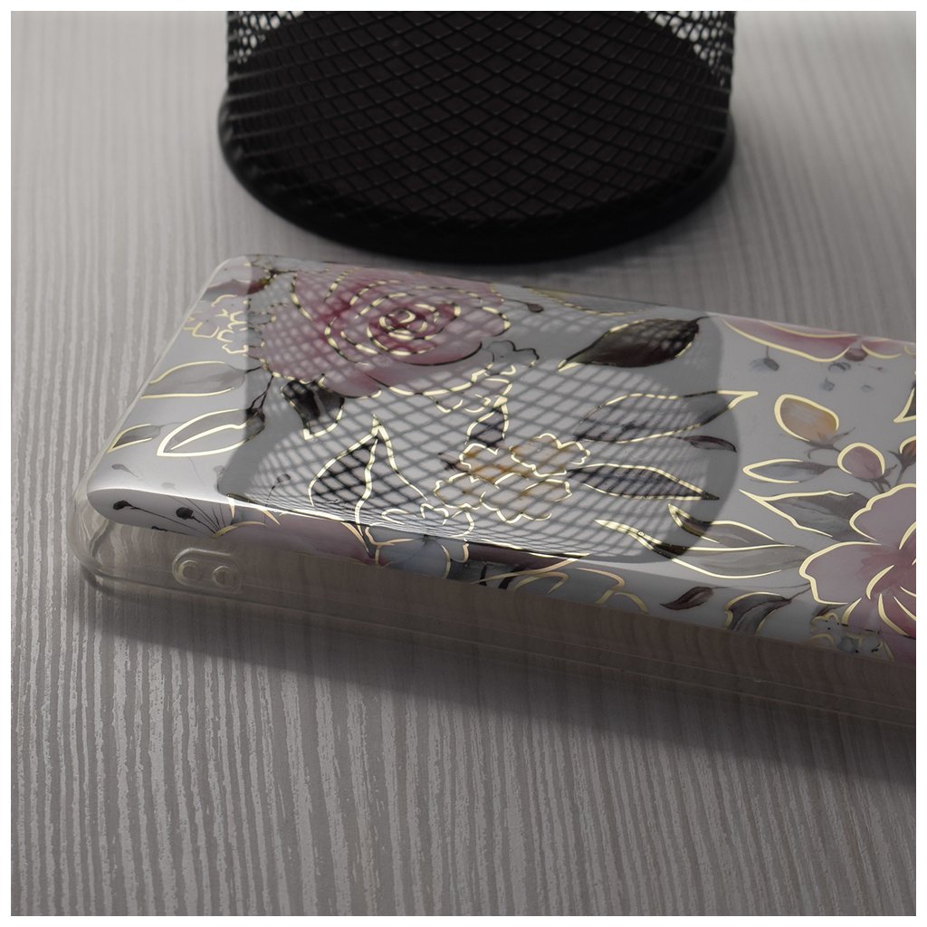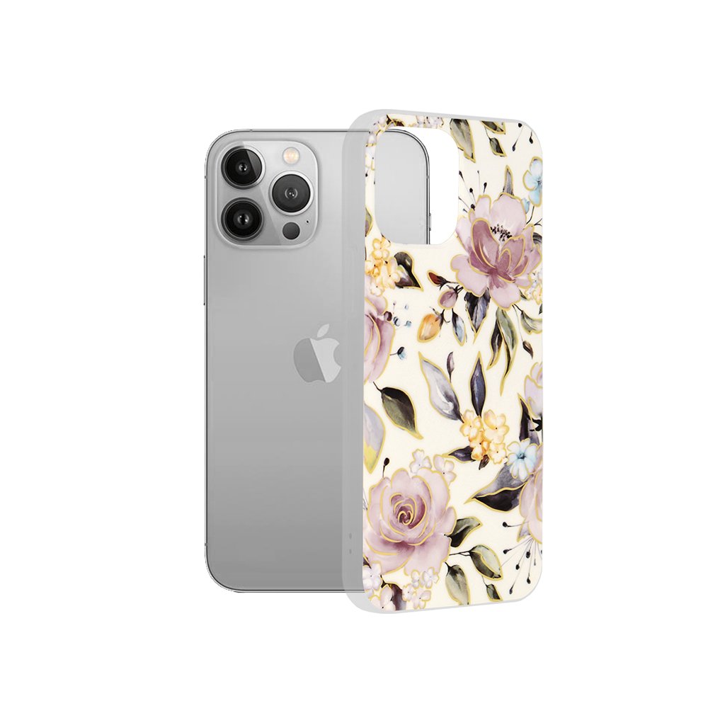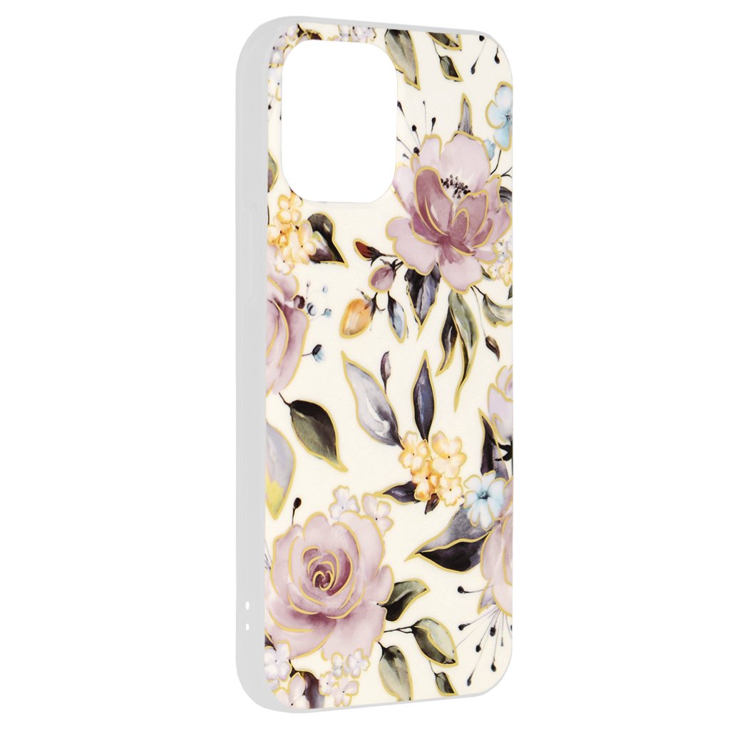 Puzdro sa pýši nádherným kvetinovým motívom na jemnom krémovo bielom podklade. Dominantnými prvkami sú veľké, nežné ruže v odtieňoch fialovej a ružovej, ktoré sú elegantne zvýraznené jemnými zlatými obrysmi. Celkový dojem dopĺňajú menšie žlté kvety a listy v tlmených zelených a sivých tónoch, vytvárajúc tak romantický a luxusný vzhľad. Tento dizajn dodá vášmu telefónu osobitý a štýlový charakter, ktorý upúta pozornosť.