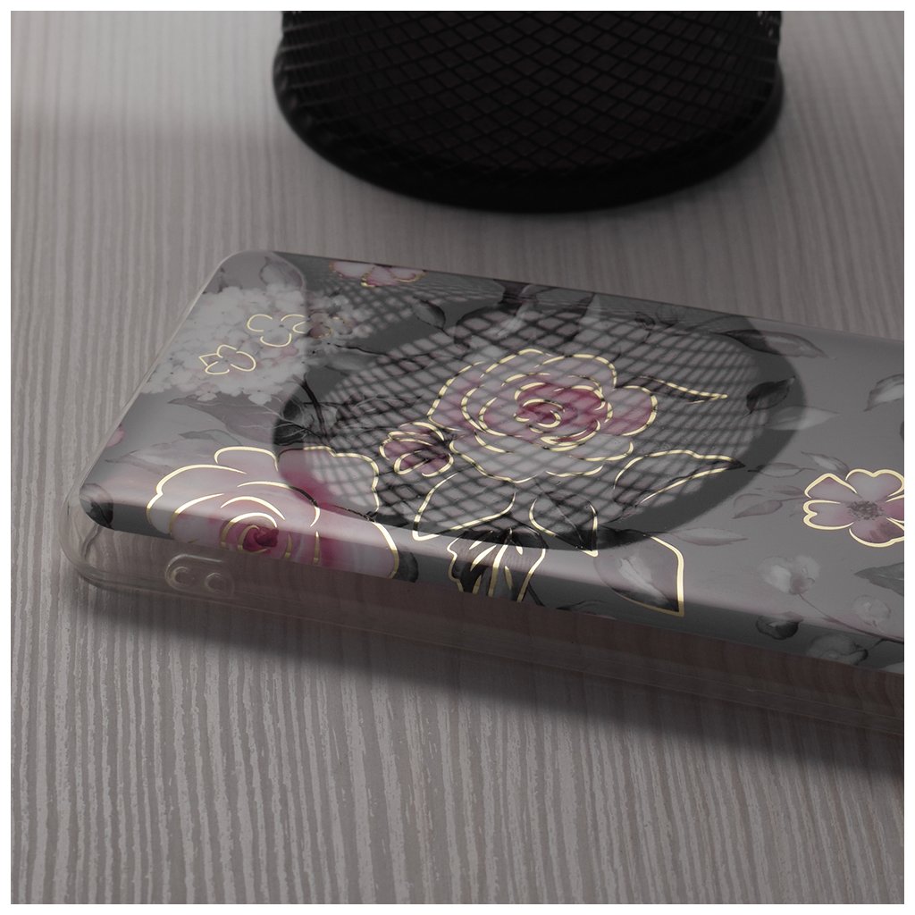Dizajn puzdra Kvet Ruth sivá zaujme na prvý pohľad. Na sivom podklade sa rozprestiera jemný kvetinový vzor, kde dominujú ružové ruže s decentnými zlatými obrysmi, doplnené o tmavosivé listy a drobné biele kvety. Celkový vzhľad pôsobí luxusne a nadčasovo, dodávajúc vášmu zariadeniu osobitý a elegantný ráz. Puzdro je vyrobené z pružného materiálu, ktorý zaisťuje jednoduchú inštaláciu a pevné uchytenie telefónu.