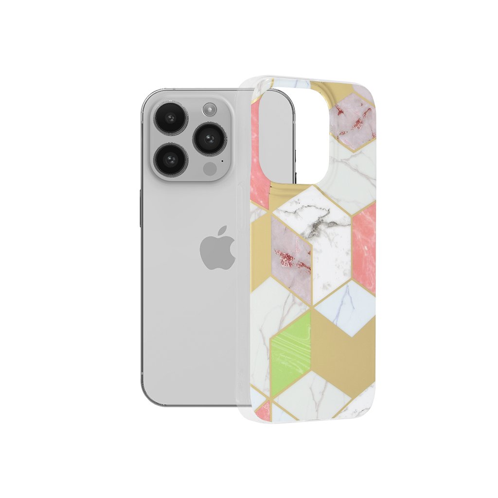 Tento kryt z mramorovej série "Purple Hex" pre iPhone 14 Pro sa pýši moderným a elegantným dizajnom. Zadná strana puzdra je zdobená geometrickým vzorom šesťuholníkov, ktoré kombinujú rôzne textúry mramoru v odtieňoch bielej, jemnej ružovej, svetlomodrej a sviežej zelenej. Tieto mramorové segmenty sú prekladané lesklými zlatými šesťuholníkmi, ktoré dodávajú celkovému vzhľadu luxusný nádych a vizuálnu hĺbku. Dizajn je dynamický a zároveň sofistikovaný, ideálny pre tých, ktorí hľadajú originálny a štýlový doplnok pre svoj telefón.
