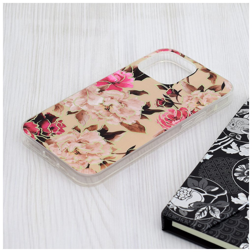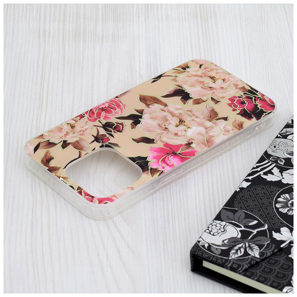 Puzdro sa pýši nádherným kvetinovým vzorom na jemnom, béžovom podklade, ktorý evokuje odtieň "nude". Dominantné sú veľké kvety v odtieňoch krémovej, sýto ružovej a tmavo červenej, doplnené hnedými listami, ktoré celkovému vzhľadu dodávajú eleganciu a jemnosť. Tento dizajn premení váš telefón na módny doplnok, ktorý podčiarkne váš osobitý štýl.