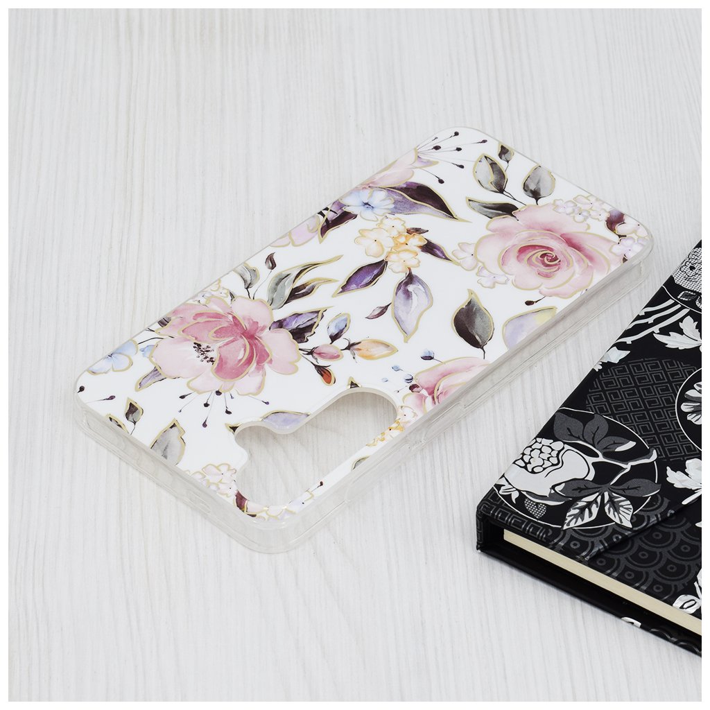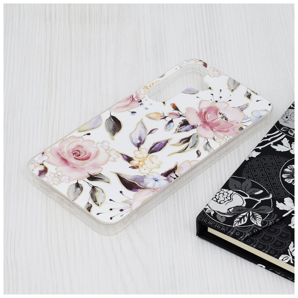 Kryt sa pýši jemným a sofistikovaným kvetinovým vzorom na čisto bielom podklade. Dominujú mu nežné ružové ruže, doplnené drobnými kvietkami v odtieňoch svetlomodrej a žltej, a listy v zemitých tónoch zelenej, fialovej a hnedej. Celý dizajn je decentne podčiarknutý zlatistými obrysmi, ktoré dodávajú puzdru punc luxusu a elegancie. Priehľadné boky krytu nechávajú vyniknúť pôvodnú farbu vášho telefónu, zatiaľ čo zadná strana s motívom Chloe biela premení váš telefón na módny doplnok.