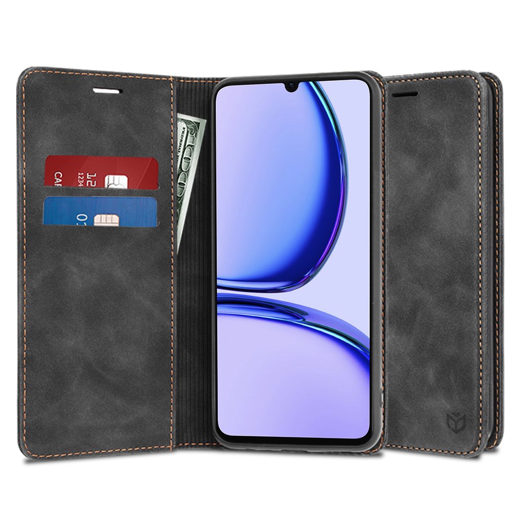 Kryt Techsuit Confy Cover pre Realme C53 v čiernej farbe sa pýši elegantným a nadčasovým dizajnom. Jeho povrch imituje brúsenú kožu alebo semiš, čo mu dodáva sofistikovaný vzhľad a príjemný pocit na dotyk. Výrazné oranžovohnedé prešívanie po okrajoch puzdra nielenže podčiarkuje precízne spracovanie, ale zároveň dodáva krytu osobitý a remeselný charakter. Ide o praktické puzdro typu "peňaženka", ktoré okrem ochrany telefónu ponúka aj vnútorné priehradky na platobné karty a bankovky, čím efektívne kombinuje štýl s funkčnosťou. Telefón je bezpečne usadený v čiernom silikónovom alebo TPU lôžku, ktoré zaisťuje spoľahlivú fixáciu a ochranu pred nárazmi.