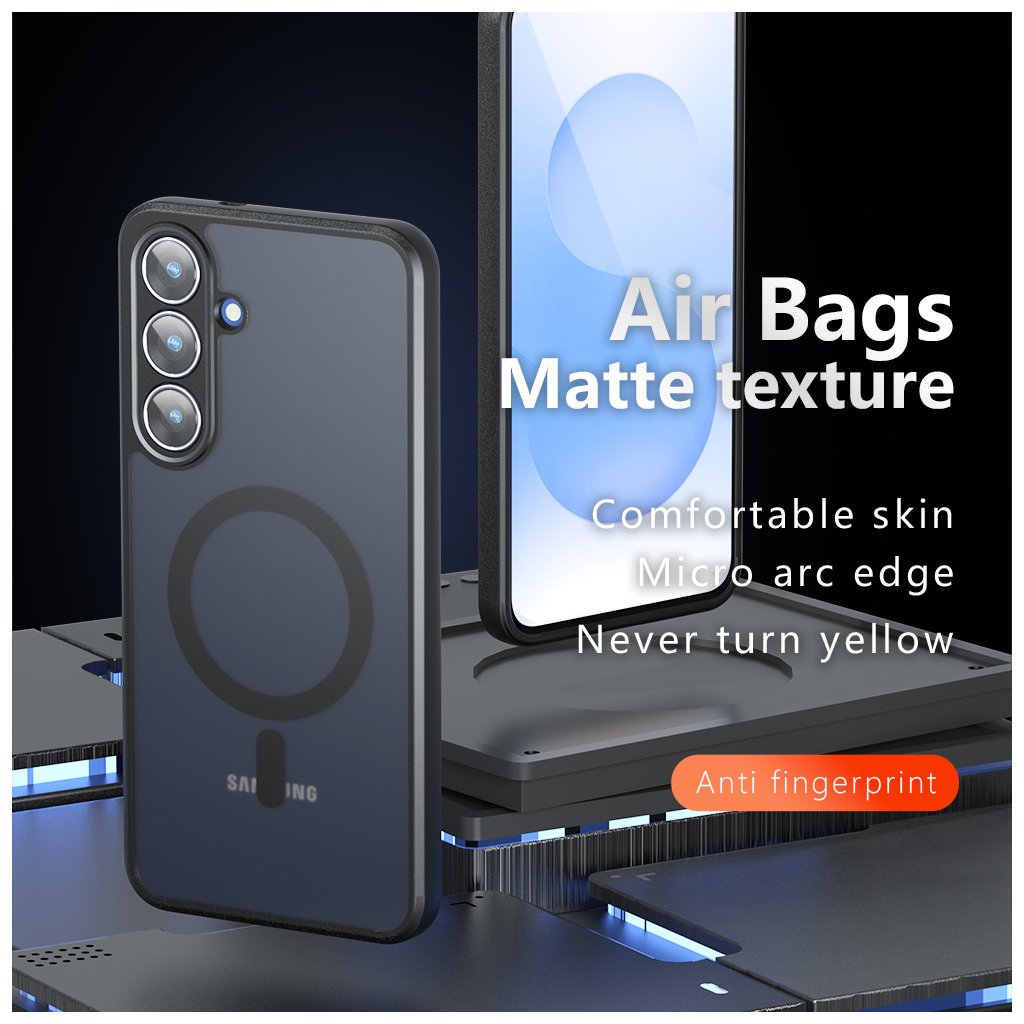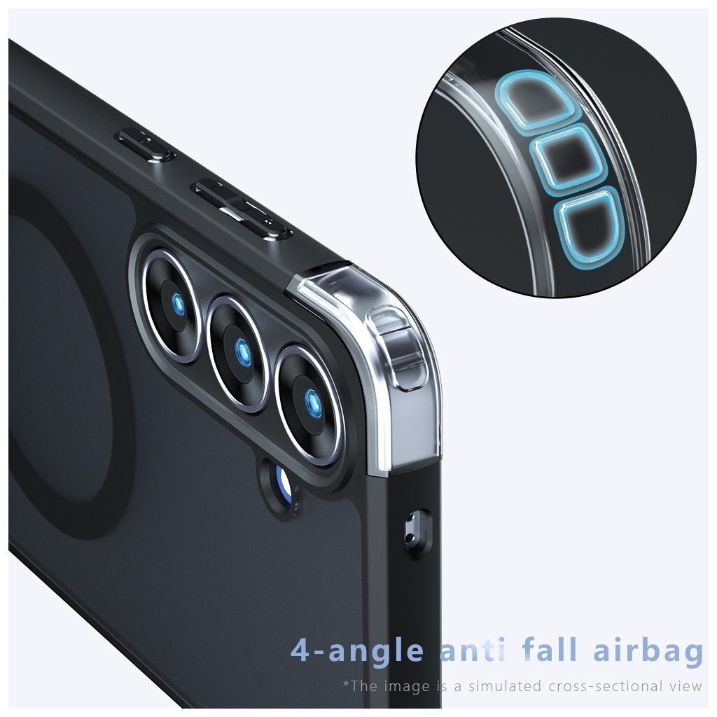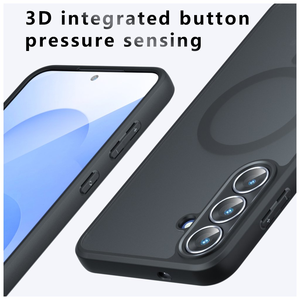 Puzdro Techsuit PureFrost MagSafe v matnej čiernej farbe sa vyznačuje elegantným a minimalistickým dizajnom. Jeho zadná strana je vyrobená z priesvitného matného materiálu, ktorý decentne odhaľuje pôvodnú farbu telefónu a zároveň zabraňuje ulpievaniu odtlačkov prstov. Integrovaný MagSafe krúžok je viditeľný na zadnej strane a zaisťuje perfektnú kompatibilitu s MagSafe príslušenstvom, čo umožňuje jednoduché a bezpečné bezdrôtové nabíjanie a pripojenie ďalších doplnkov.
