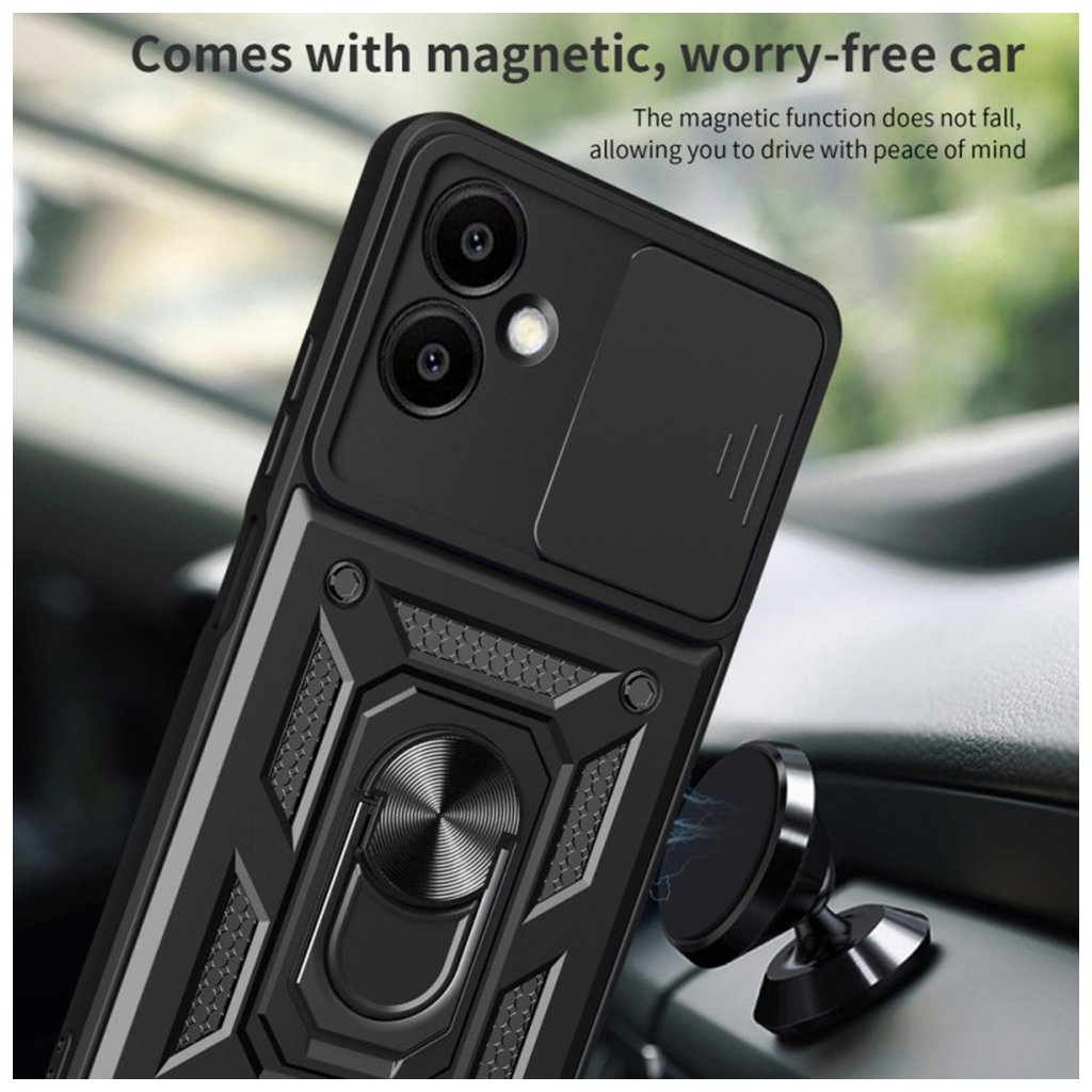 Praktickým doplnkom je integrovaný kovový krúžok, ktorý slúži ako stojanček pre pohodlné sledovanie obsahu alebo ako bezpečný úchyt pre stabilnejšie držanie telefónu. Tento krúžok je navyše vybavený magnetickou doskou, ktorá umožňuje jednoduché a bezpečné uchytenie telefónu do magnetických držiakov v aute.