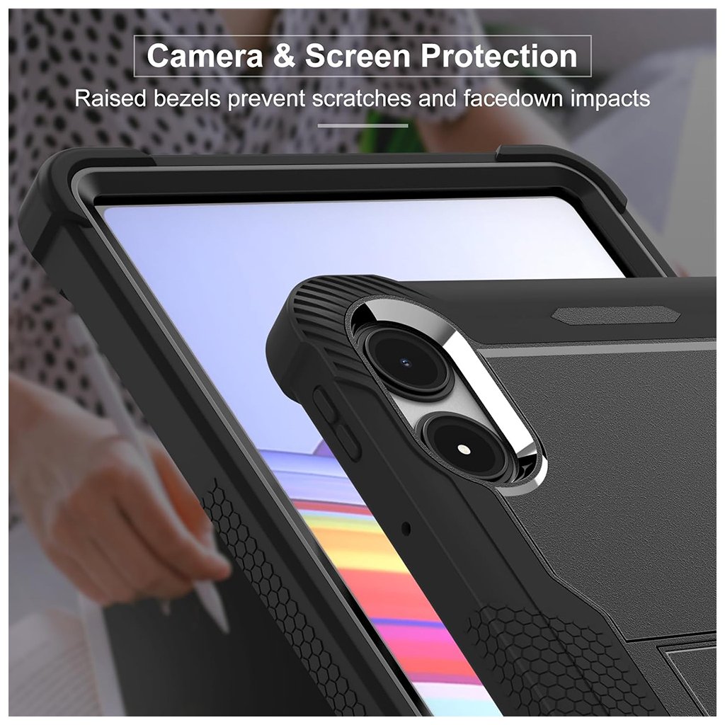 Toto robustné puzdro v čiernej farbe sa vyznačuje premysleným dizajnom, ktorý kombinuje odolnosť s praktickosťou. Je vyrobené z kvalitných materiálov, ktoré efektívne absorbujú nárazy a chránia tablet pred poškodením. Zosilnené rohy poskytujú extra tlmenie nárazov, čo minimalizuje riziko poškodenia pri pádoch. Zvýšené okraje okolo displeja a fotoaparátu zaisťujú ochranu proti poškriabaniu a nárazom, aj keď je tablet položený displejom nadol.