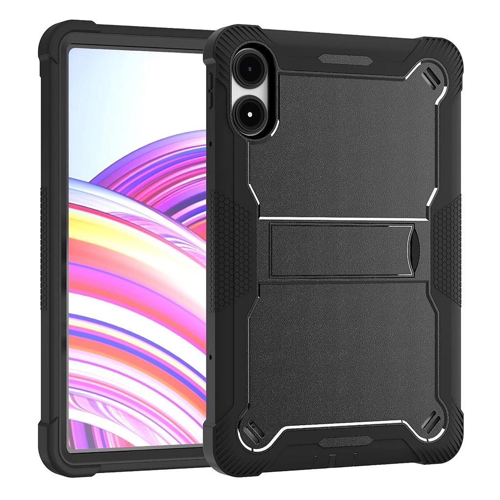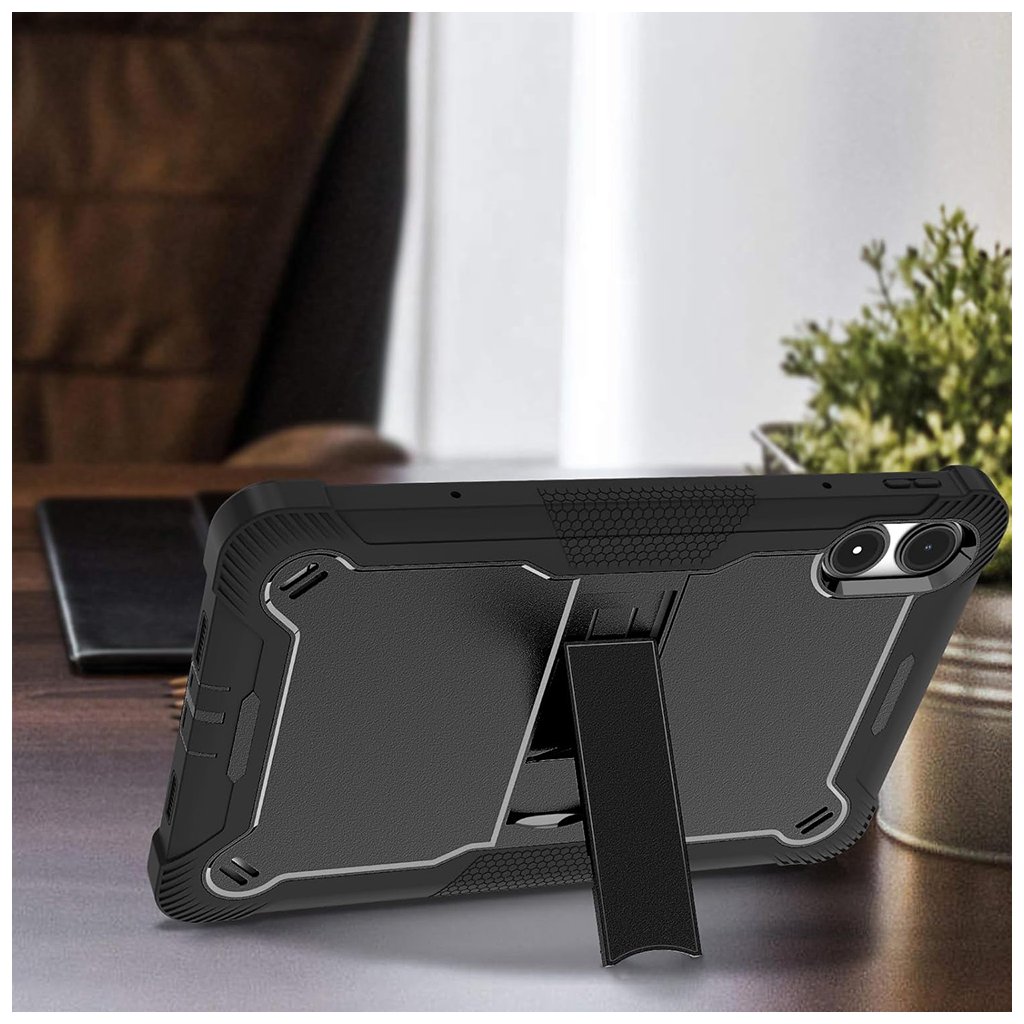 Povrch puzdra je opatrený protišmykovou textúrou, najmä na bokoch s hexagonálnym vzorom, čo zaisťuje pevný a istý úchop. Integrovaný výklopný stojan na zadnej strane umožňuje pohodlné sledovanie obsahu v horizontálnej polohe, ideálne pre prácu, sledovanie filmov alebo videohovory. Všetky výrezy pre porty, tlačidlá a fotoaparát sú precízne spracované, čo zaručuje ľahký prístup a bezproblémové používanie.