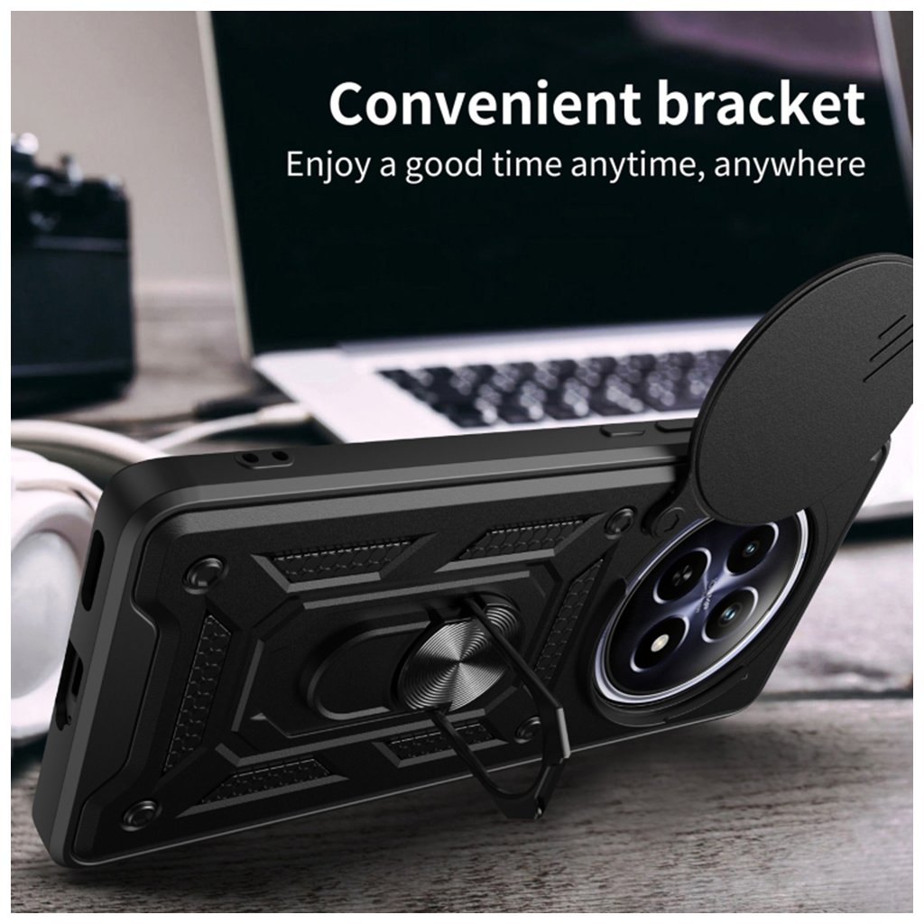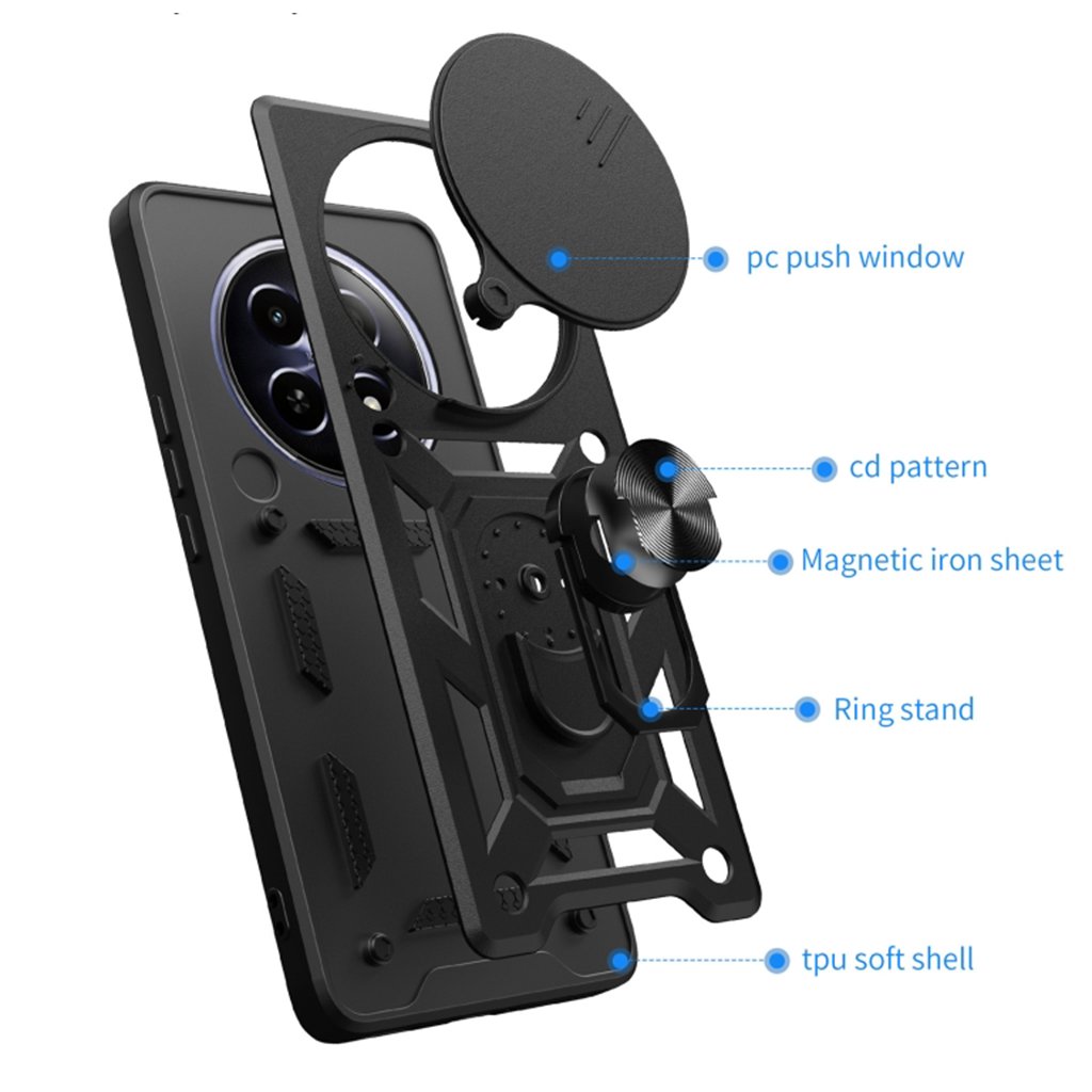 Puzdro Techsuit CamShield pre Xiaomi 14 Ultra v elegantnej modrej farbe sa vyznačuje robustným a taktickým dizajnom, ktorý poskytuje maximálnu ochranu. Je vyrobené z kombinácie mäkkého TPU a odolného PC materiálu, čo zaisťuje vysokú odolnosť proti nárazom a pádom. Spĺňa štandard MIL STD 810G-516.6 pre ochranu proti pádu. Kľúčovým prvkom je posuvný kryt objektívu, ktorý efektívne chráni citlivé fotoaparáty vášho telefónu pred poškriabaním a nečistotami. Na zadnej strane puzdra nájdete integrovaný kovový krúžok, ktorý slúži ako praktický stojan alebo bezpečný úchyt. Krúžok je navyše vybavený magnetickou doskou pre ľahké pripevnenie k magnetickým držiakom v aute. Textúrovaný povrch puzdra zlepšuje úchop a minimalizuje riziko vykĺznutia telefónu z ruky.