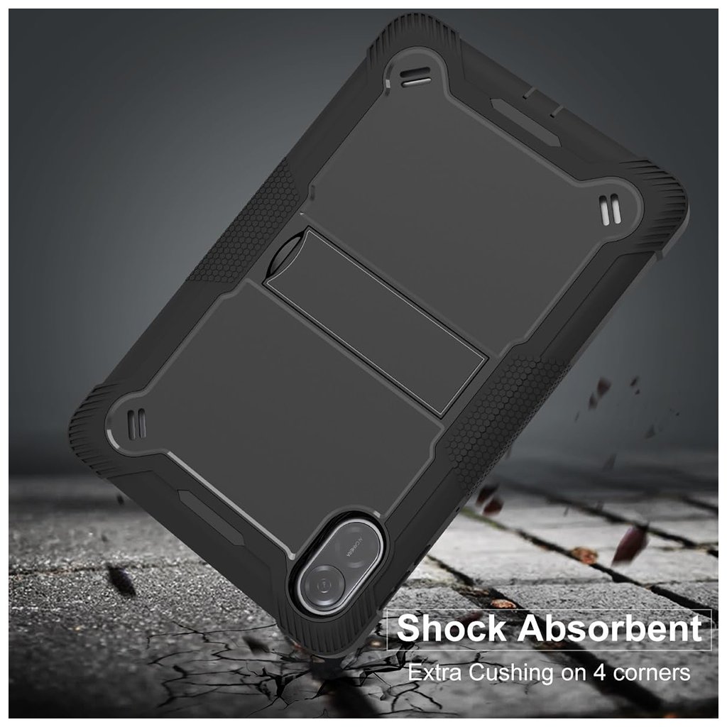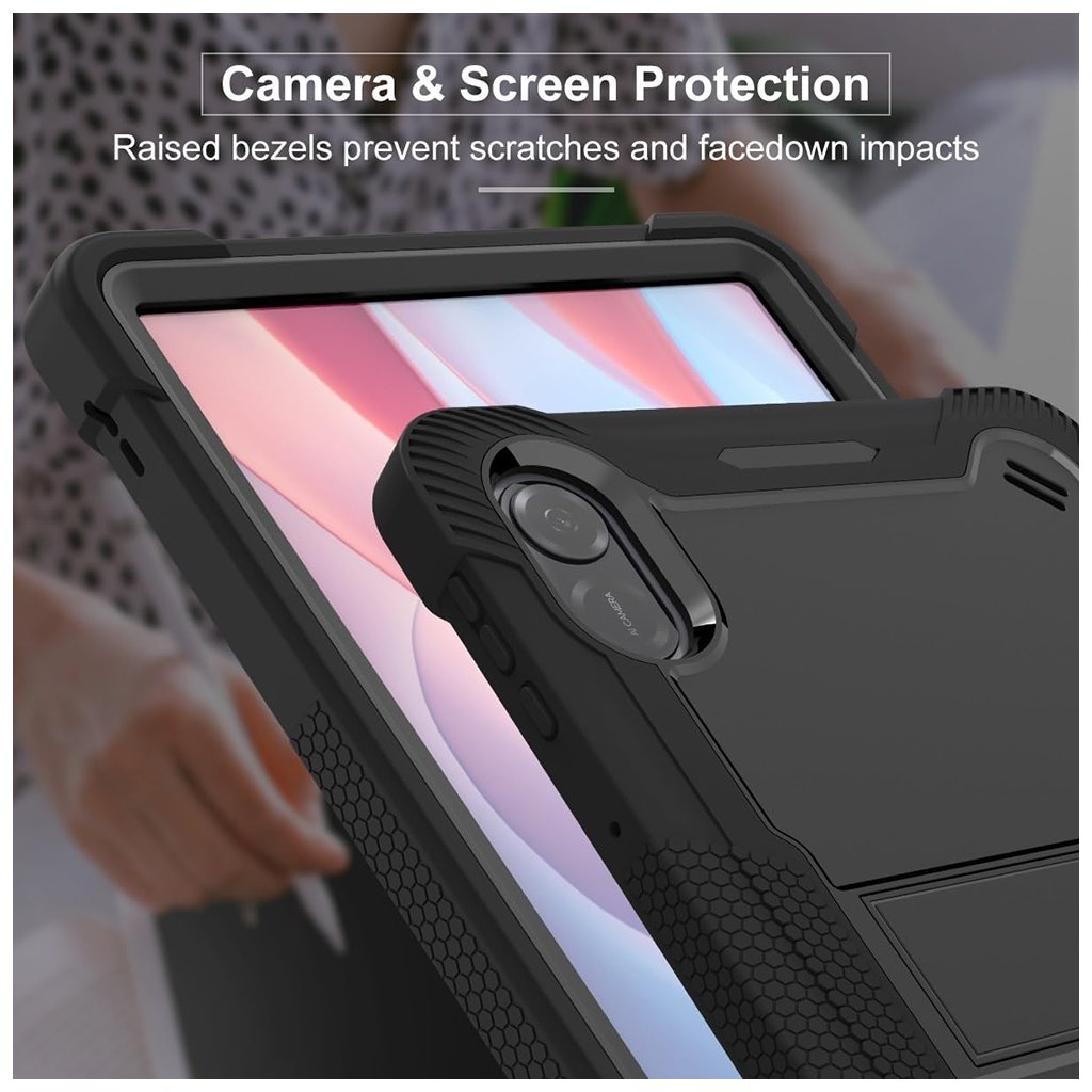 Puzdro Techsuit Rugged TabShell sa pýši robustným, avšak elegantným dizajnom v klasickej čiernej farbe. Jeho povrch je textúrovaný, čo zaisťuje pevný a istý úchop a minimalizuje riziko vykĺznutia. Zvýšené okraje okolo displeja a fotoaparátu poskytujú dodatočnú ochranu proti poškriabaniu pri položení na rovný povrch. Precízne výrezy zaručujú ľahký prístup ku všetkým portom, tlačidlám a funkciám tabletu, bez toho, aby ste museli puzdro dávať dole. Súčasťou balenia je aj ochranná fólia na displej, ktorá chráni obrazovku pred poškriabaním a nečistotami, a zároveň zachováva perfektnú citlivosť dotyku a jasnosť obrazu.