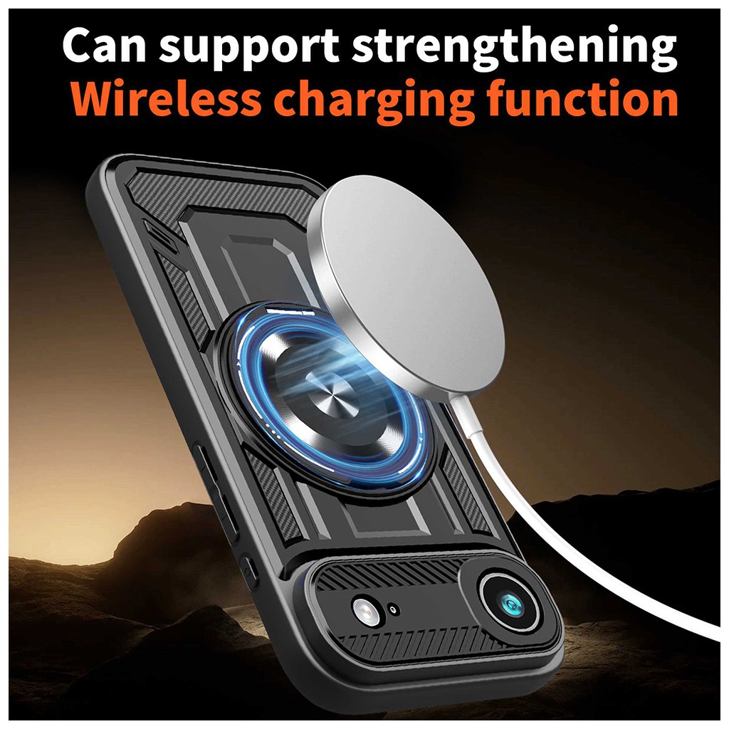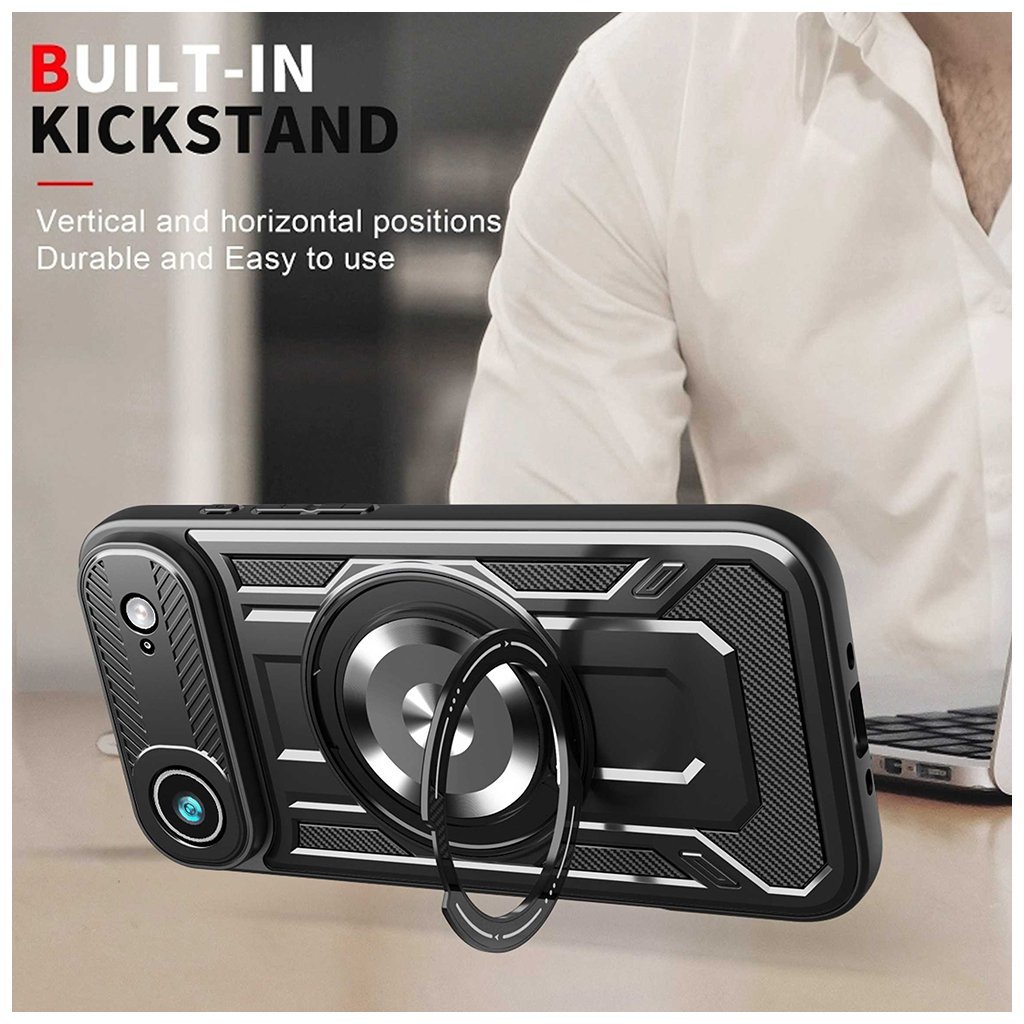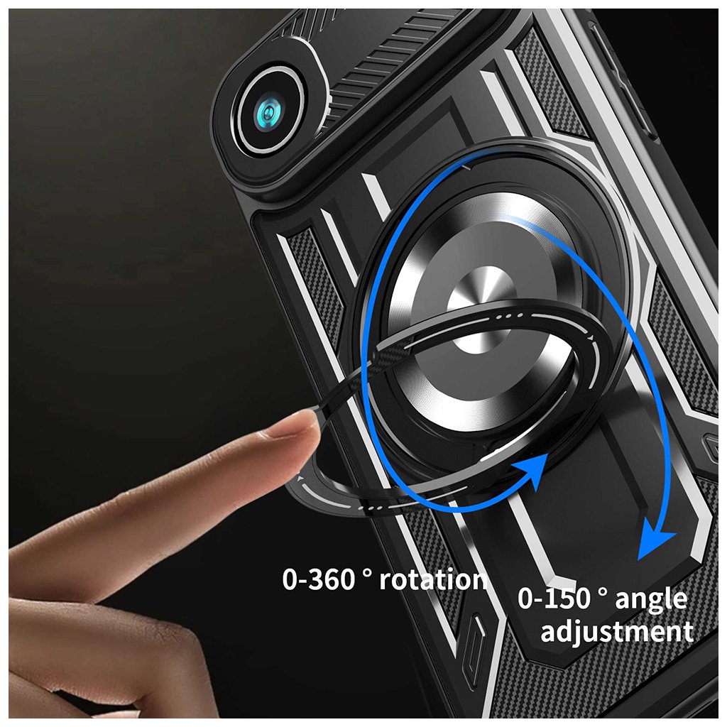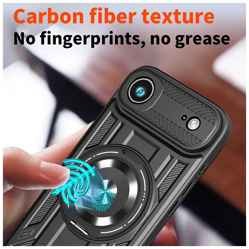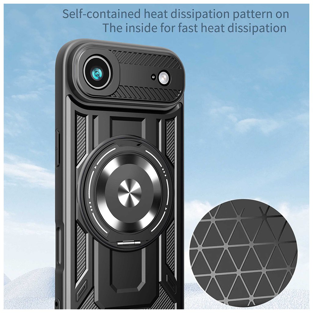 Kryt Techsuit RuggedCam v elegantnej čiernej farbe sa pýši robustným a taktickým dizajnom, ktorý okamžite upúta pozornosť. Jeho povrch kombinuje hladké línie s textúrou pripomínajúcou karbonové vlákna na bokoch, čo dodáva krytu moderný a športový vzhľad. Dominantným prvkom zadnej strany je integrovaný kovový krúžok, ktorý slúži nielen ako praktický držiak pre pevnejší úchop, ale aj ako stabilný stojanček pre pohodlné sledovanie obsahu. Tento krúžok je navyše kompatibilný s magnetickými držiakmi. Oblasť okolo fotoaparátu je zvýšená a precízne tvarovaná, aby poskytovala maximálnu ochranu citlivým šošovkám pred poškriabaním a nárazmi. Celkový dizajn je premyslený tak, aby váš iPhone 17 Air bol chránený zo všetkých strán, aniž by stratil svoj elegantný profil.