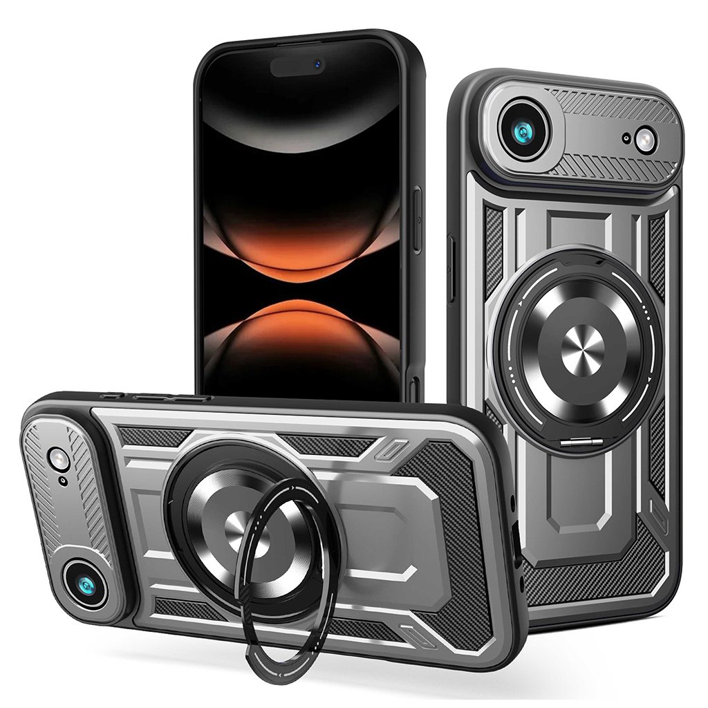 Puzdro Techsuit RuggedCam pre iPhone 17 Air v šedej farbe sa vyznačuje robustným a moderným dizajnom, ktorý podčiarkuje jeho ochranné vlastnosti. Kombinácia šedých a čiernych prvkov s textúrou pripomínajúcou karbonové vlákna dodáva puzdru dynamický a prémiový vzhľad.