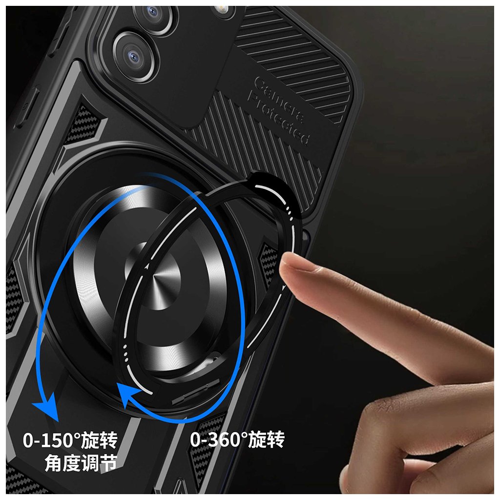 Integrovaný posuvný kryt fotoaparátu zaisťuje kompletnú ochranu objektívov pred poškodením a nečistotami, keď ich nepoužívate. Kľúčovým prvkom dizajnu je aj multifunkčný kovový krúžok na zadnej strane. Ten slúži ako praktický stojanček pre pohodlné sledovanie obsahu v režime na šírku aj na výšku, a zároveň ako bezpečný úchyt pre lepšiu manipuláciu s telefónom. Krúžok je otočný o 360° a nastaviteľný v uhle 0-150°, čo umožňuje flexibilné použitie. Uvnitř puzdra sa nachádza špeciálny vzor pre rýchly odvod tepla, ktorý pomáha udržať optimálnu teplotu zariadenia.