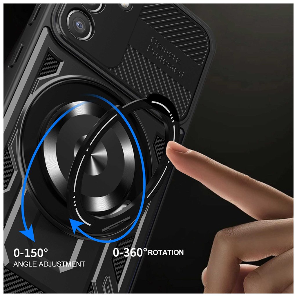 Puzdro Techsuit RuggedCam sa pýši odolným a funkčným dizajnom, ktorý je okamžite patrný. Jeho čierna farba dodáva telefónu sofistikovaný vzhľad, zatiaľ čo robustná konštrukcia zaisťuje maximálne bezpečie. Na zadnej strane krytu dominuje posuvný kryt fotoaparátu s nápisom "Camera Protected", ktorý efektívne chráni čočky pred poškriabaním a nečistotami.