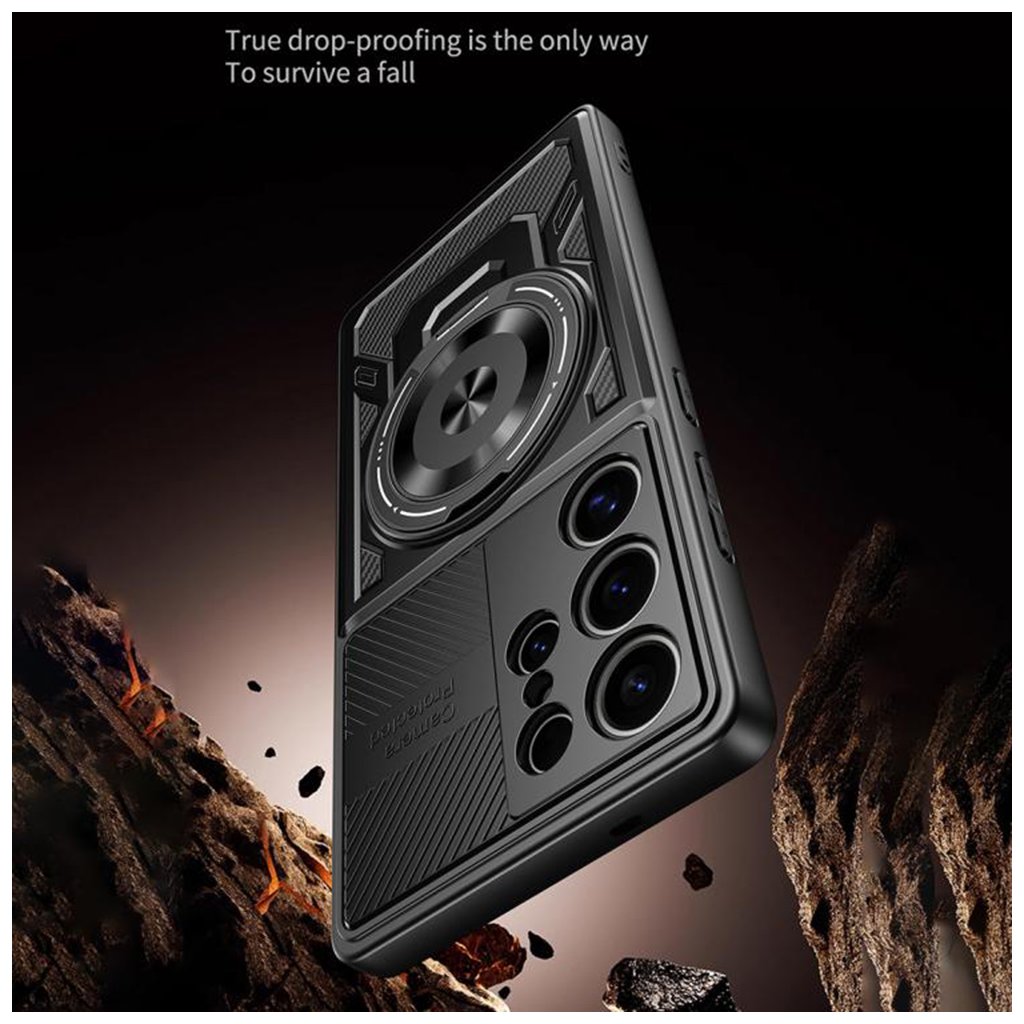 Puzdro Techsuit RuggedCam sa vyznačuje moderným a funkčným dizajnom, ktorý kombinuje odolnosť s praktickými prvkami. Zadná strana krytu je rozdelená na niekoľko textúrovaných plôch, ktoré zaisťujú pevný úchop a dodávajú puzdru dynamický vzhľad. Dominantným prvkom je integrovaný posuvný kryt fotoaparátu, ktorý chráni šošovky pred poškriabaním a nečistotami, keď nie sú používané.