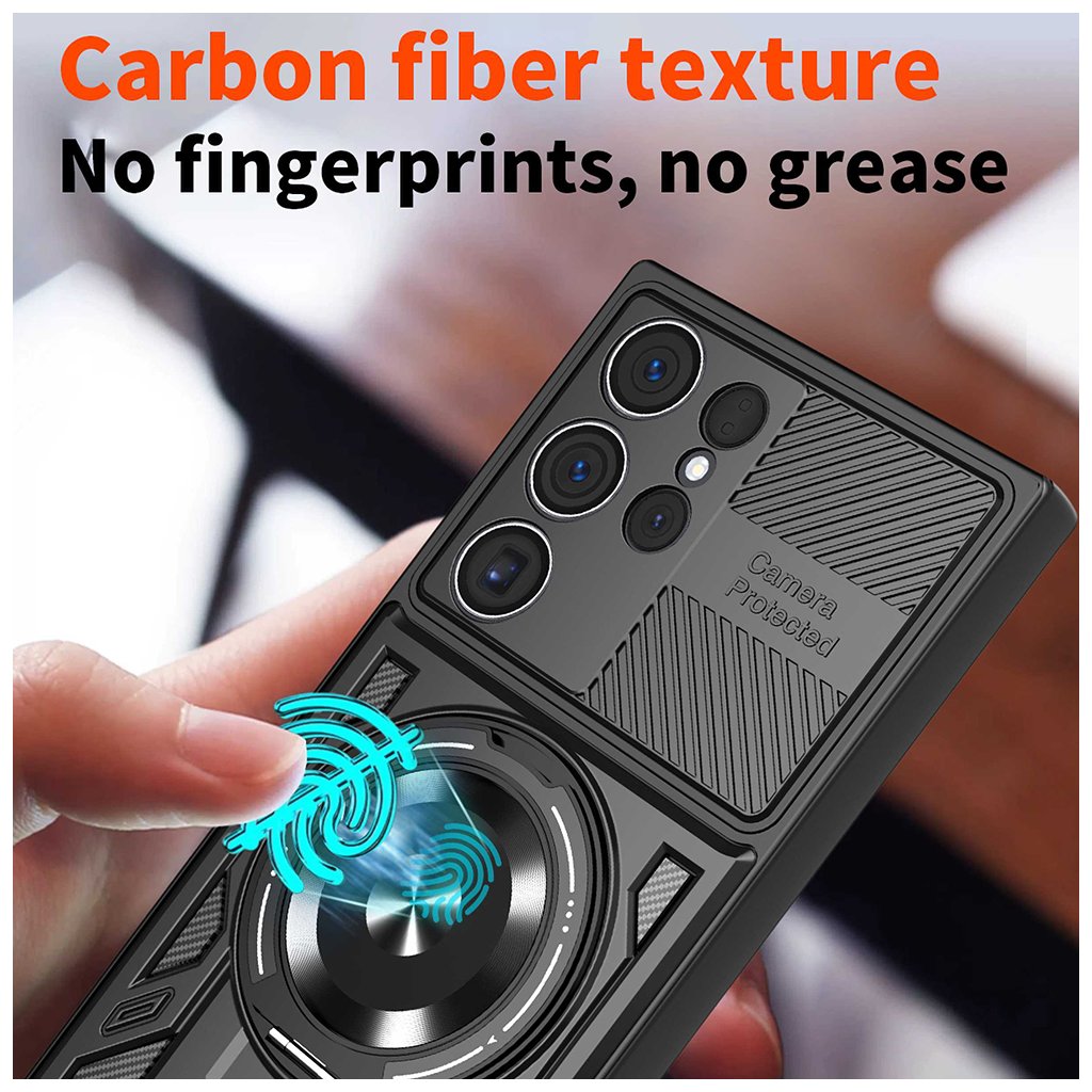 Integrovaný kovový krúžok slúži ako praktický stojanček pre pohodlné sledovanie obsahu alebo ako bezpečný úchyt pre lepšiu manipuláciu s telefónom. Krúžok je navyše kompatibilný s magnetickými držiakmi, čo zvyšuje jeho univerzálnosť. Kombinácia pevných a pružných materiálov, vrátane detailov s textúrou imitujúcou karbonové vlákna, zaručuje vysokú absorpciu nárazov a dlhú životnosť.