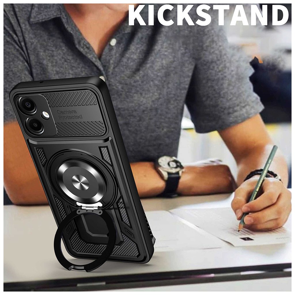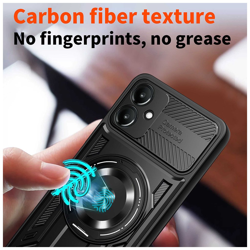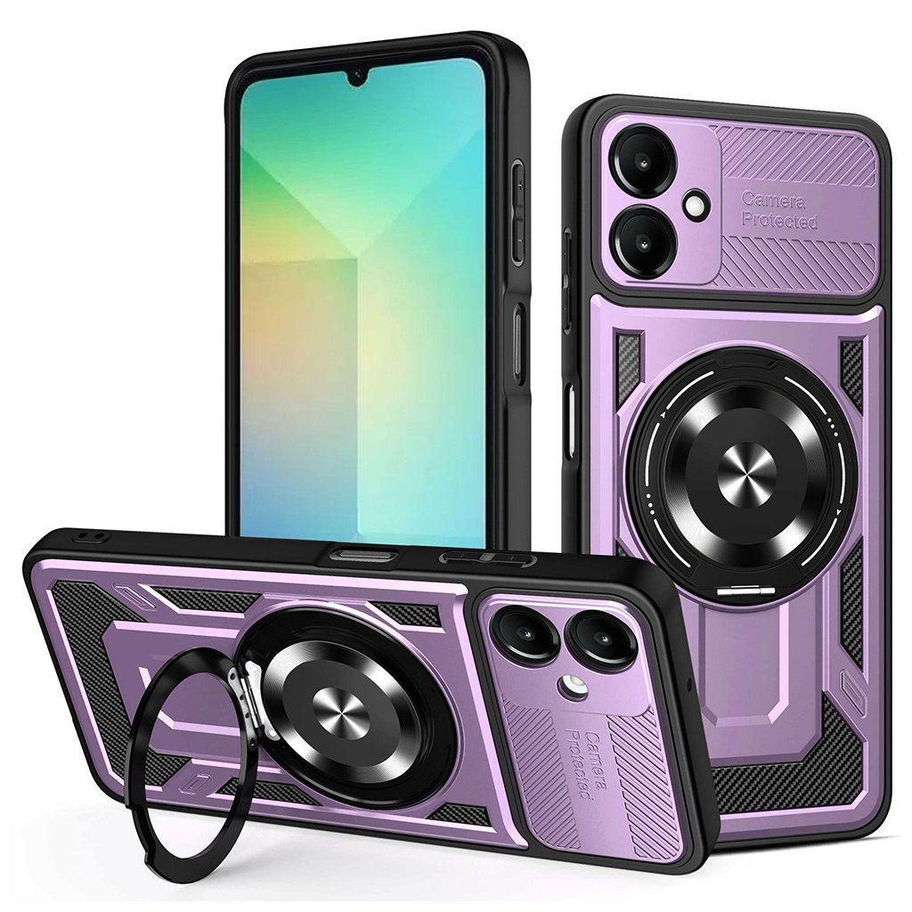 Techsuit RuggedCam pre Samsung Galaxy A06 fialová Predstavujeme Techsuit RuggedCam, robustné ochranné puzdro navrhnuté špeciálne pre váš Samsung Galaxy A06. Toto puzdro v elegantnej fialovej farbe kombinuje špičkovú ochranu s premysleným dizajnom, ktorý podčiarkne štýl vášho telefónu a zároveň zaistí jeho maximálnu bezpečnosť. Dizajn a parametre Puzdro Techsuit RuggedCam sa pýši odolným a funkčným dizajnom. Jeho fialové telo je doplnené čiernymi detailmi a textúrou pripomínajúcou karbónové vlákna, čo mu dodáva moderný a športový vzhľad.- Kľúčovým prvkom je integrovaný posuvný kryt fotoaparátu, ktorý spoľahlivo chráni šošovky pred poškriabaním a nečistotami, keď ich nepoužívate.