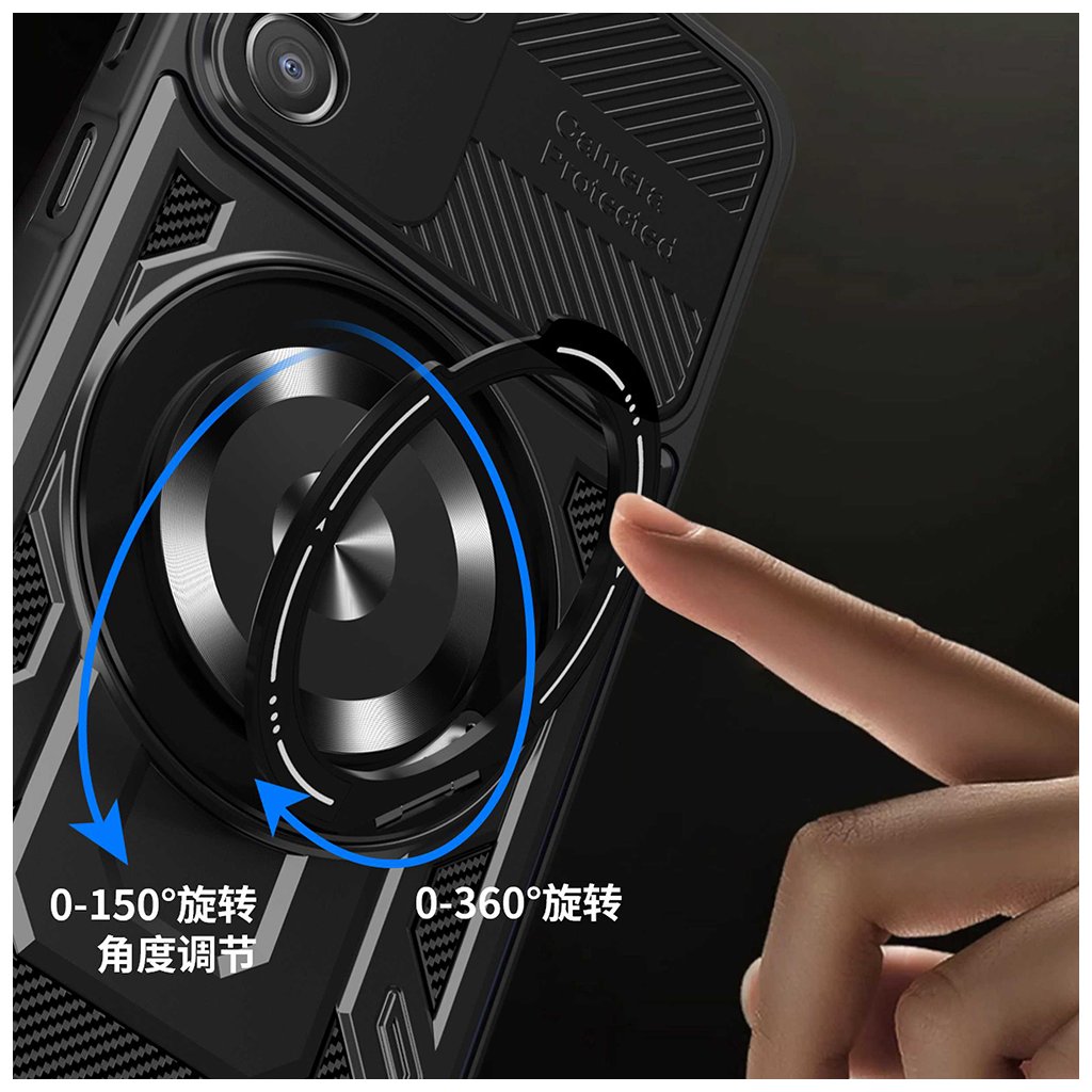 - Dominantným prvkom je integrovaný posuvný kryt fotoaparátu s nápisom "Camera Protected", ktorý efektívne chráni šošovky pred poškriabaním a nečistotami.