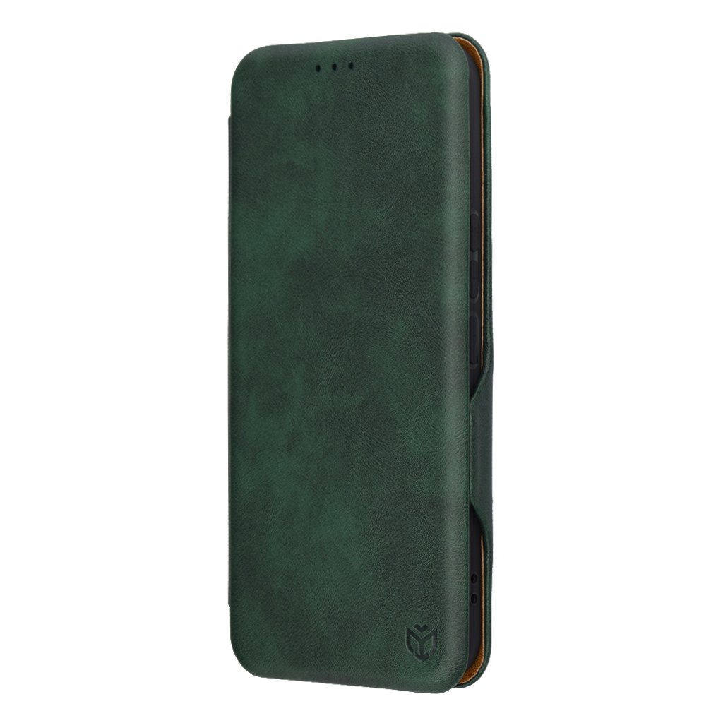 Puzdro Techsuit Safe Wallet Plus sa pýši sofistikovaným dizajnom, ktorý okamžite upúta pozornosť. Jeho vonkajšia strana je vyrobená z materiálu s jemnou textúrou, pripomínajúcou brúsenú kožu, v hlbokom zelenom odtieni, ktorý dodáva puzdru luxusný a nadčasový vzhľad. Vnútorná strana puzdra je v kontrastnej svetlohnedej farbe, čo podčiarkuje jeho elegantnú estetiku.