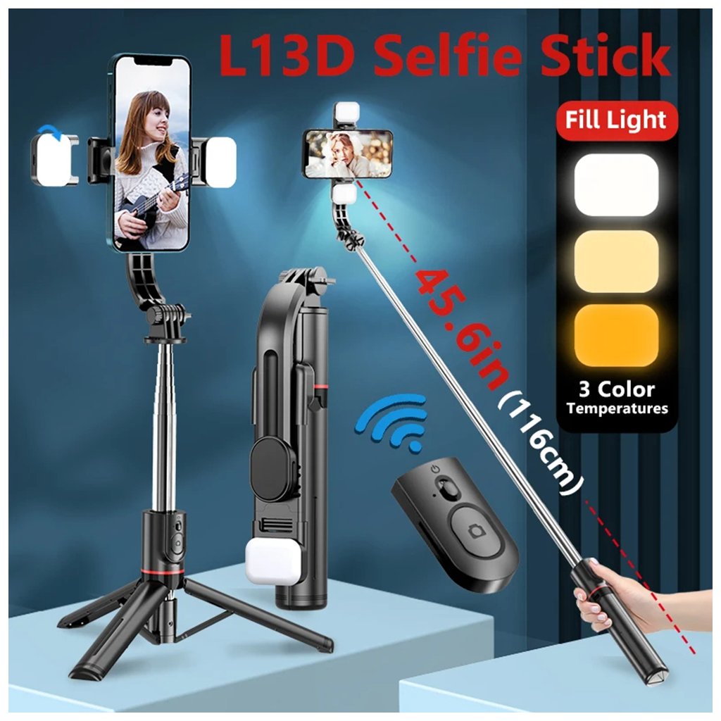 Techsuit Selfie tyč L13d statív dvojité svetlo Bluetooth 116cm čierna Objavte novú úroveň mobilnej fotografie a videografie s Techsuit Selfie tyčou L13d. Tento inovatívny produkt v sebe spája funkcie selfie tyče a stabilného statívu, čo z neho robí nepostrádateľného spoločníka pre každého, kto chce zachytiť dokonalé okamihy. Vďaka svojmu premyslenému dizajnu a pokročilým funkciám je ideálny pre cestovanie, vlogovanie, skupinové fotografie alebo živé vysielanie. Kľúčové vlastnosti:- Dvojité výplňové svetlo: Integrované dve svetlá zaisťujú optimálne osvetlenie za akýchkoľvek podmienok.