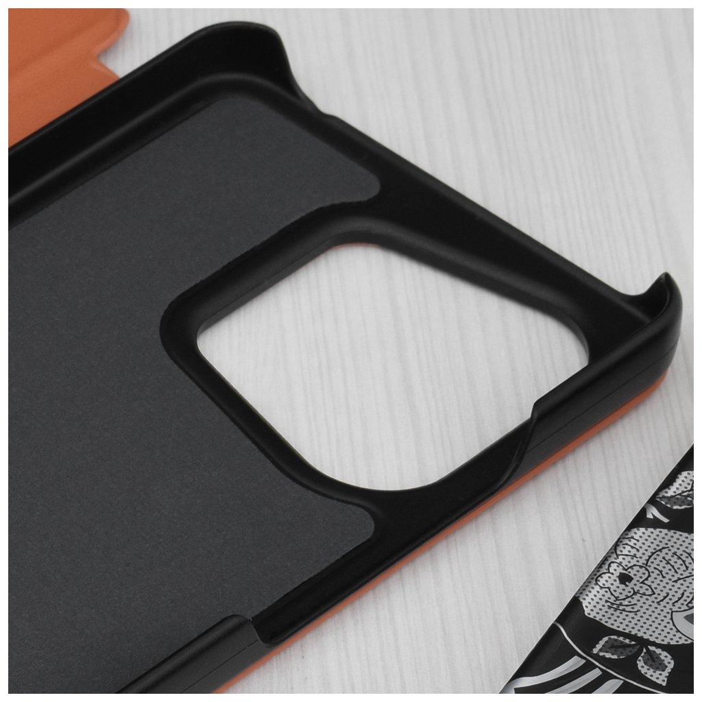Puzdro Techsuit eFold Series sa pýši elegantným knižkovým dizajnom, ktorý obopína telefón zo všetkých strán a poskytuje mu komplexnú ochranu. Vonkajší povrch je vyhotovený v textúrovanom materiáli imitujúcom kožu v sýto oranžovom odtieni, čo dodáva puzdru luxusný vzhľad a príjemný pocit na dotyk. Kľúčovým prvkom je priehľadný vertikálny pás na prednej strane, ktorý umožňuje jednoduchý náhľad na čas, dátum a notifikácie bez nutnosti otvárať puzdro.