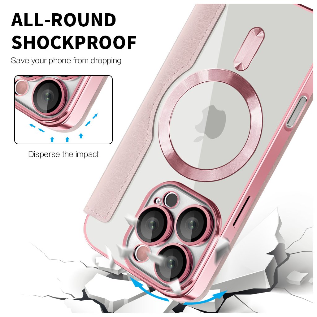 - Rámeček okolo fotoaparátu a integrovaný MagSafe krúžok sú elegantne zvýraznené v ladícom ružovom odtieni, čo podčiarkuje celkový moderný vzhľad puzdra a zaisťuje kompatibilitu s MagSafe príslušenstvom.