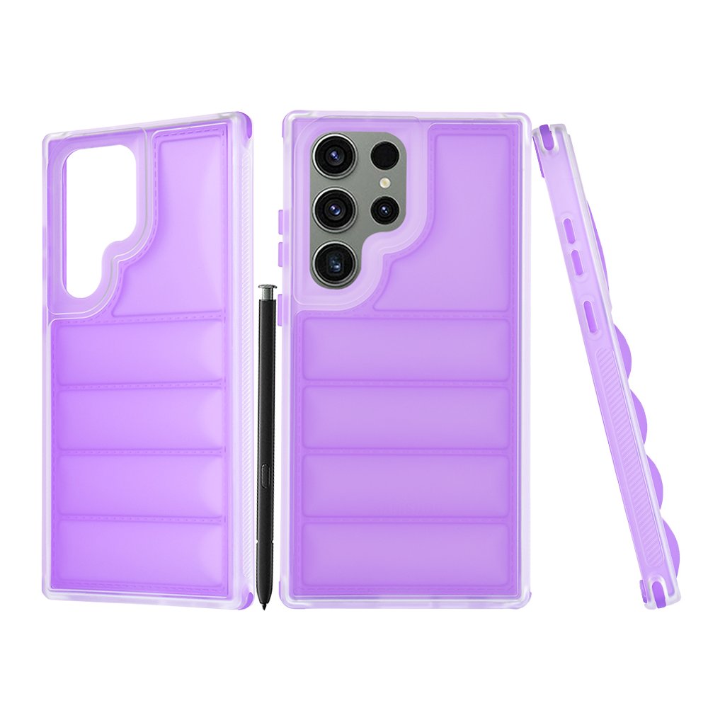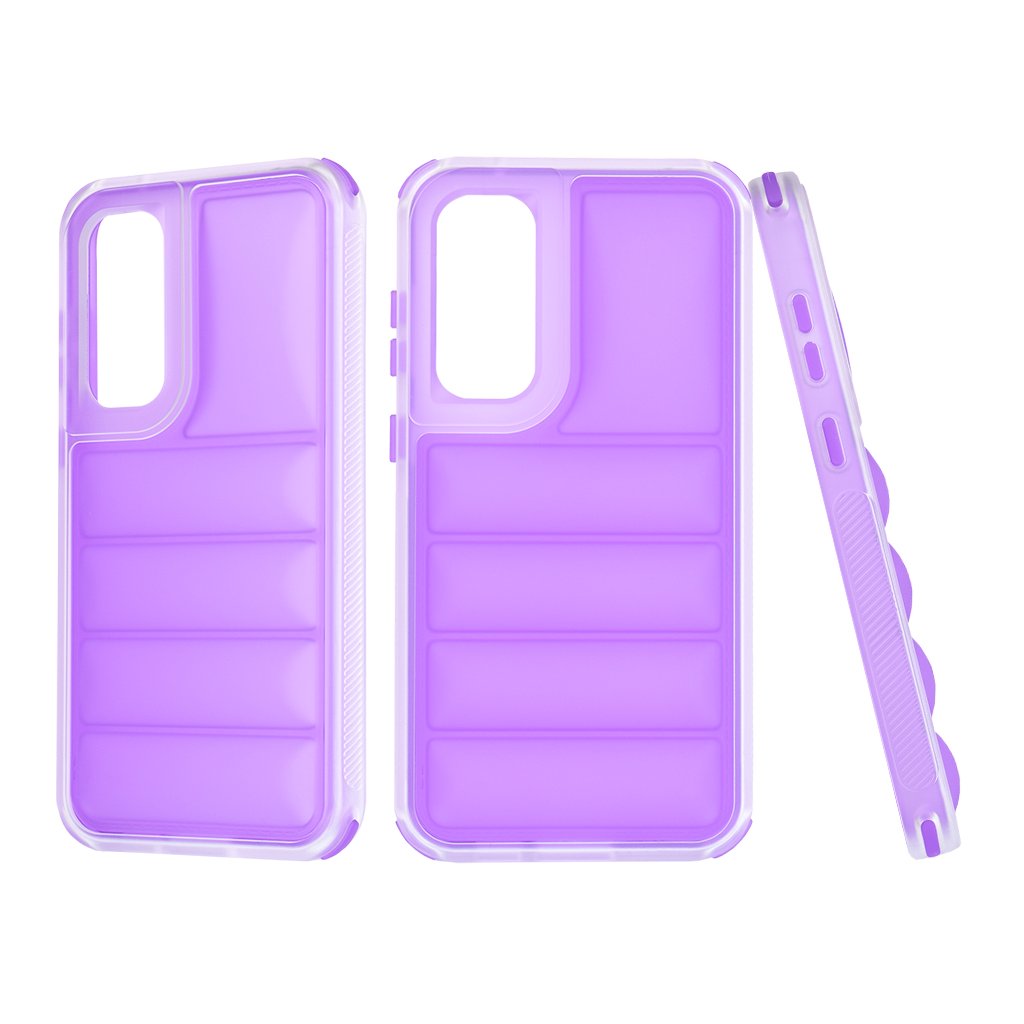 Puzdro Techsuit Wave Shield sa vyznačuje unikátnym dizajnom, ktorý pripomína prešívanú bundu alebo vlnitý povrch. Zadná strana je členená do horizontálnych pruhov s jemným polstrovaním, čo nielenže dodáva puzdru štýlový vzhľad, ale taktiež zlepšuje úchop a minimalizuje riziko vykĺznutia z ruky. Okraje puzdra sú priehľadné, čo umožňuje vyniknúť pôvodnej farbe telefónu, zatiaľ čo fialová zadná časť dodáva sofistikovaný nádych. Presné výrezy zaisťujú bezproblémový prístup ku všetkým konektorom, mikrofónom, reproduktorom a fotoaparátom, bez toho, aby obmedzovali funkčnosť zariadenia. Tlačidlá sú chránené, ale zároveň si zachovávajú istý a príjemný stisk.