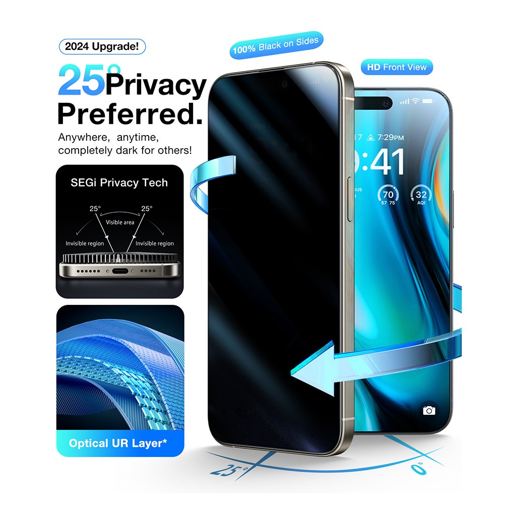 - Pokročilá technológia: Vďaka technológii SEGI Privacy Tech je obsah vášho displeja dokonale viditeľný iba pre vás. Z uhlov väčších ako 25 stupňov sa obrazovka stáva pre okolie úplne nečitelnou a čiernou, čo efektívne chráni vaše citlivé dáta pred zvedavými pohľadmi.