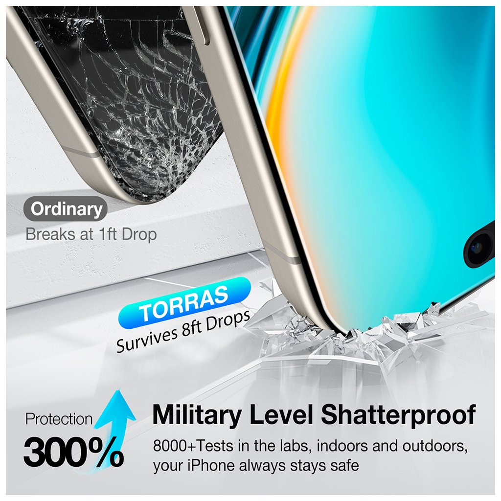 - Vojenská úroveň odolnosti: Toto sklo ponúka vojenskú úroveň odolnosti proti rozbitiu (Military Level Shatterproof), ktorá je až o 300 % vyššia ako u bežných skiel. Bolo testované vo viac ako 8000 laboratórnych aj reálnych testoch, aby zabezpečilo, že váš iPhone zostane v bezpečí aj pri pádoch z výšky až 2,4 metra (8ft).