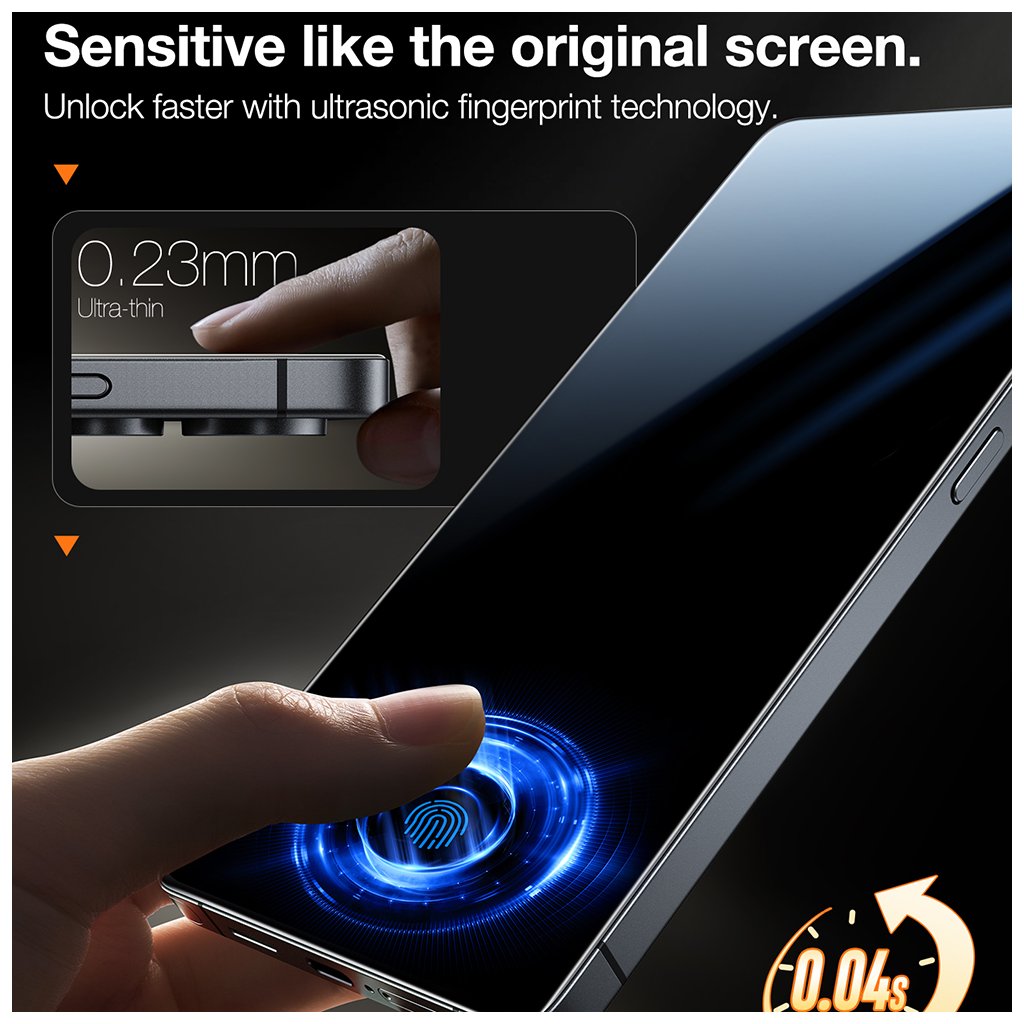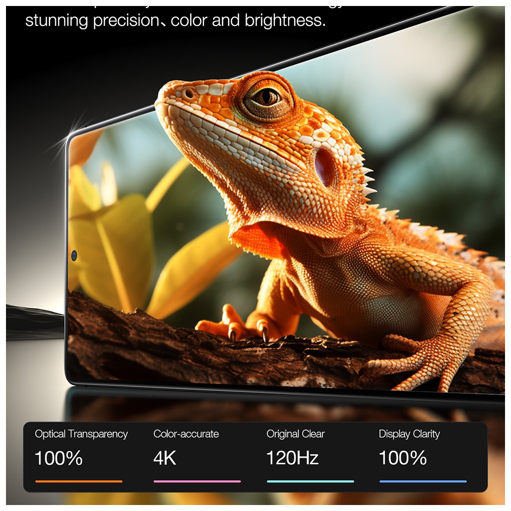 Užite si krištáľovo čistý obraz s 100% optickou priesvitnosťou a presnosťou farieb 4K, ktoré nijako neovplyvnia kvalitu zobrazenia ani obnovovaciu frekvenciu 120Hz. Sklo je navrhnuté pre plné pokrytie od okraja k okraju, čo znamená, že dokonale splynie s displejom vášho telefónu bez medzier a viditeľných okrajov. Navyše je plne kompatibilné s ultrazvukovou technológiou odtlačkov prstov, čo umožňuje rýchle a spoľahlivé odomykanie bez akýchkoľvek kompromisov.
