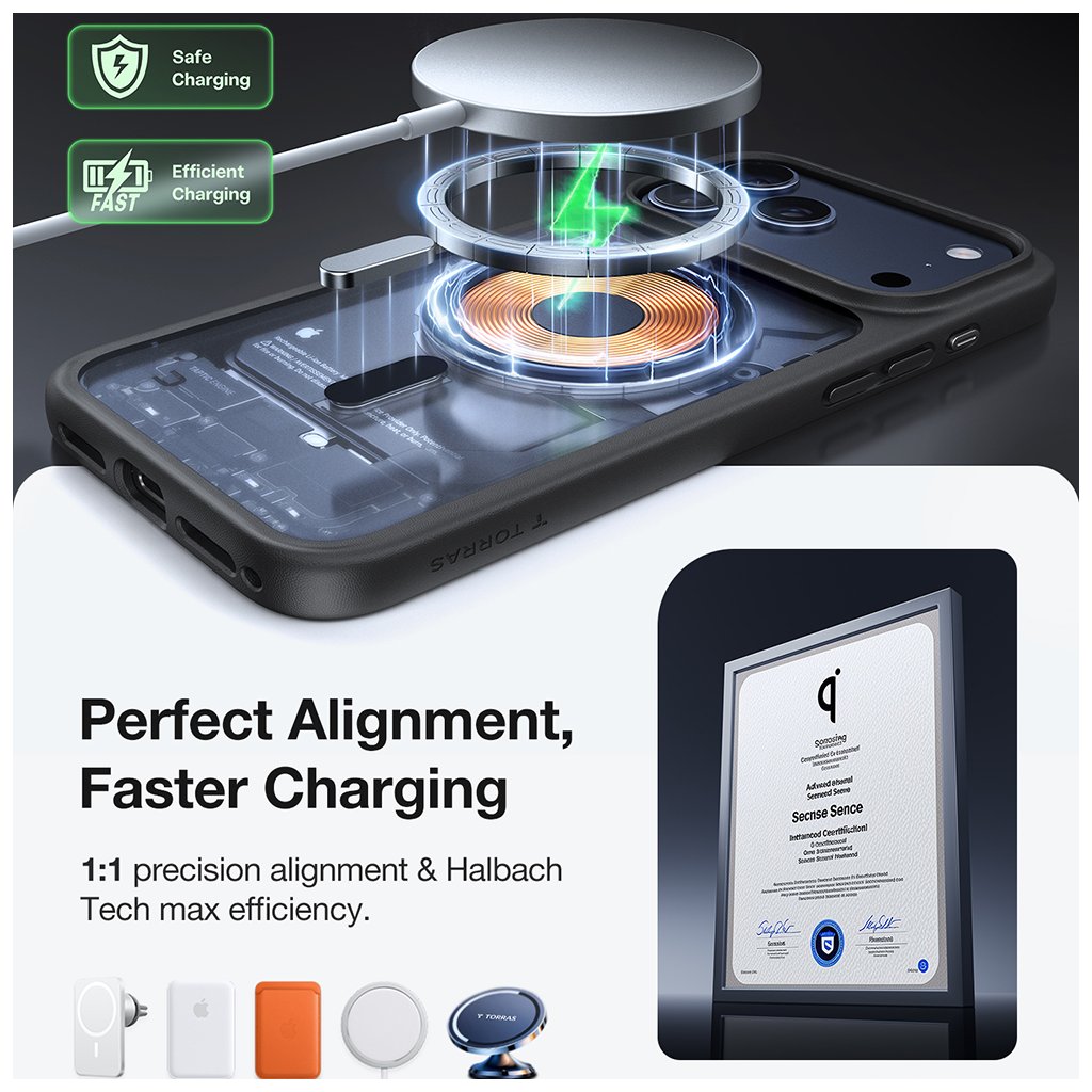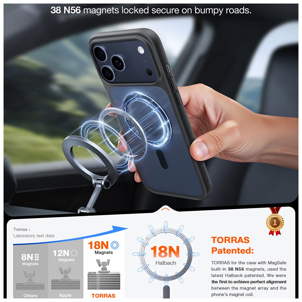 Integrovaný MagSafe krúžok na zadnej strane zaručuje perfektné zarovnanie a rýchle, bezpečné bezdrôtové nabíjanie a plnú kompatibilitu s MagSafe príslušenstvom. Puzdro je vybavené patentovanou technológiou Halbach s 38 N56 magnetmi, ktoré zaisťujú silné a stabilné magnetické spojenie aj na nerovných cestách.