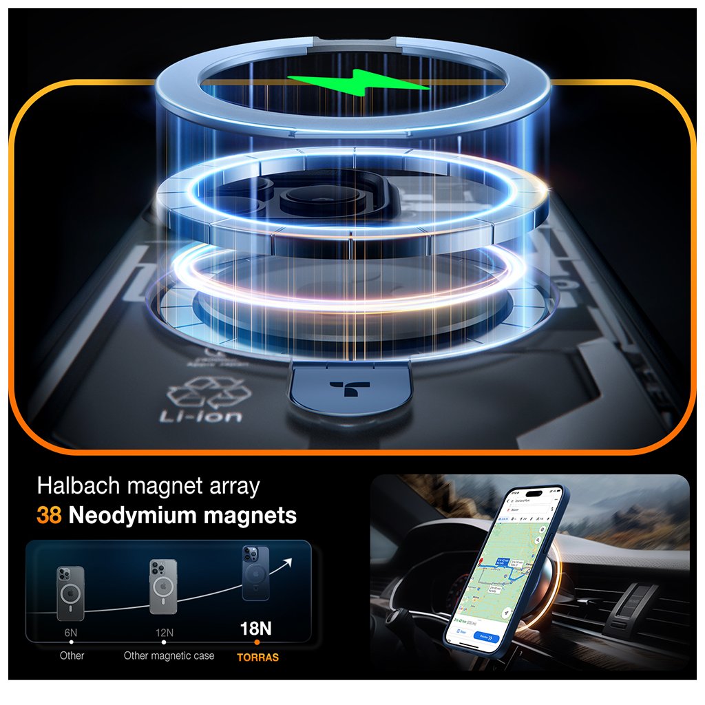 - Kryt je plne kompatibilný s technológiou MagSafe, a to vďaka integrovanému Halbach magnetickému poli s 38 neodymovými magnetmi, ktoré zabezpečujú mimoriadne silné a stabilné pripojenie k MagSafe príslušenstvu s magnetickou silou 18N.