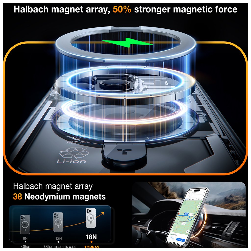 Inovatívny dizajn zahŕňa integrovaný MagSafe krúžok, ktorý je nielen plne kompatibilný so všetkým MagSafe príslušenstvom, ale slúži aj ako diskrétny a stabilný stojan. Tento krúžok využíva Halbach magnetické pole s 38 neodymovými magnetmi, čo zaisťuje o 50 % silnejšiu magnetickú silu (až 18N) než bežné kryty, pre bezpečné a spoľahlivé uchytenie.