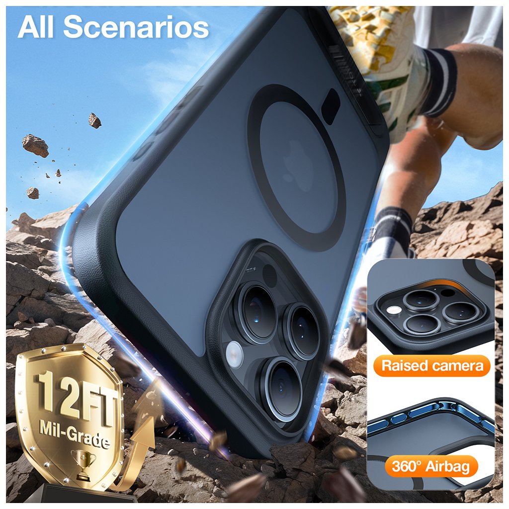 S puzdrom Torras Pstand MagSafe sa nemusíte obávať každodenných nástrah. Vďaka patentovanej technológii X-SHOCK a 360° airbagom poskytuje extrémnu absorpciu nárazov a ochranu na vojenskej úrovni (Military Grade), testovanú na pády z výšky až 3,6 metra (12FT). Zvýšené okraje okolo displeja a modulu fotoaparátu navyše chránia tieto najcitlivejšie časti telefónu pred poškriabaním a priamymi nárazmi.