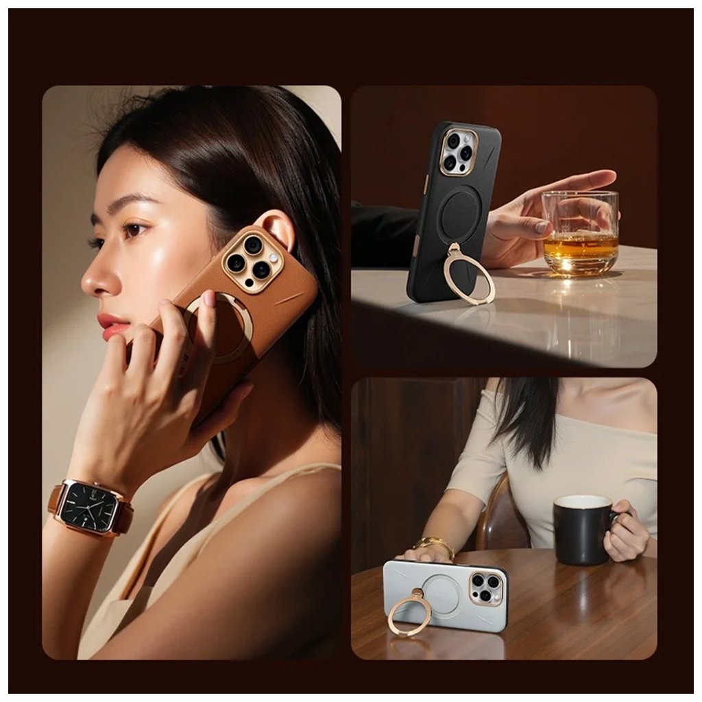 * **Materiál:** Prémiová koža s textúrou, odolná proti škvrnám. * **Farba:** Elegantná čierna. * **Dizajn:** Minimalistický s kovovými detailmi a zvýšeným rámikom fotoaparátu. * **Integrovaný stojan:** Kovový krúžok s 360° rotáciou pre stabilné a bezpečné polohovanie. * **Kompatibilita:** Plná podpora MagSafe pre bezdrôtové nabíjanie a príslušenstvo. * **Ochrana:** Zvýšené okraje pre ochranu displeja a fotoaparátu. * **Tlačidlá:** Precízne kovové tlačidlá pre jednoduché ovládanie. * **Určené pre:** iPhone 17 Pro MaxDodatočné parametre