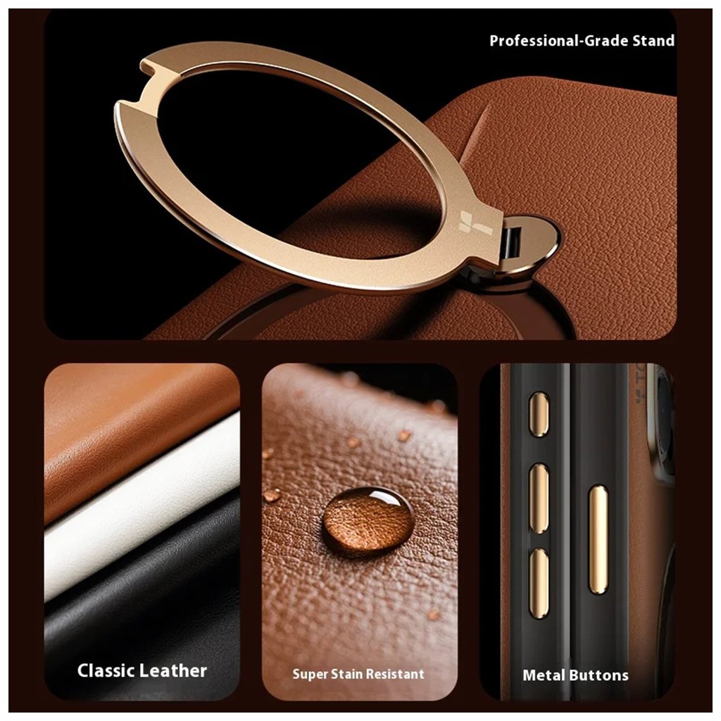 Dizajn puzdra QPRO Leather Series je stelesnením minimalistickej elegancie. Zadná strana je potiahnutá **klasickou kožou s jemnou textúrou**, ktorá je nielen príjemná na dotyk, ale aj super odolná proti škvrnám a opotrebovaniu. Precízne spracovanie dopĺňajú **kovové tlačidlá** a **zvýšený rámik okolo fotoaparátu v sofistikovanom zlatom odtieni**, ktoré dodávajú puzdru punc exkluzivity a zároveň chránia citlivé šošovky pred poškriabaním.Inovatívna Funkčnosť pre Váš Komfort