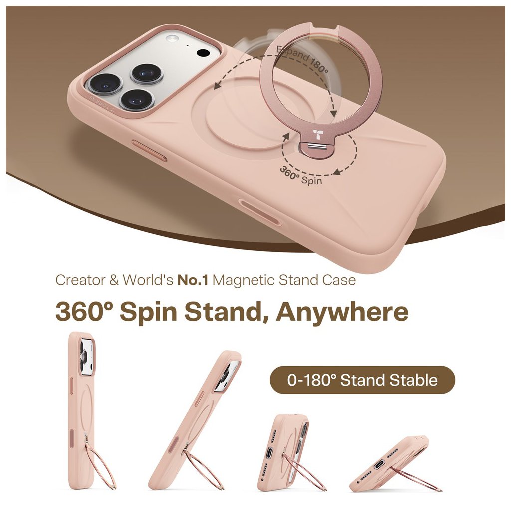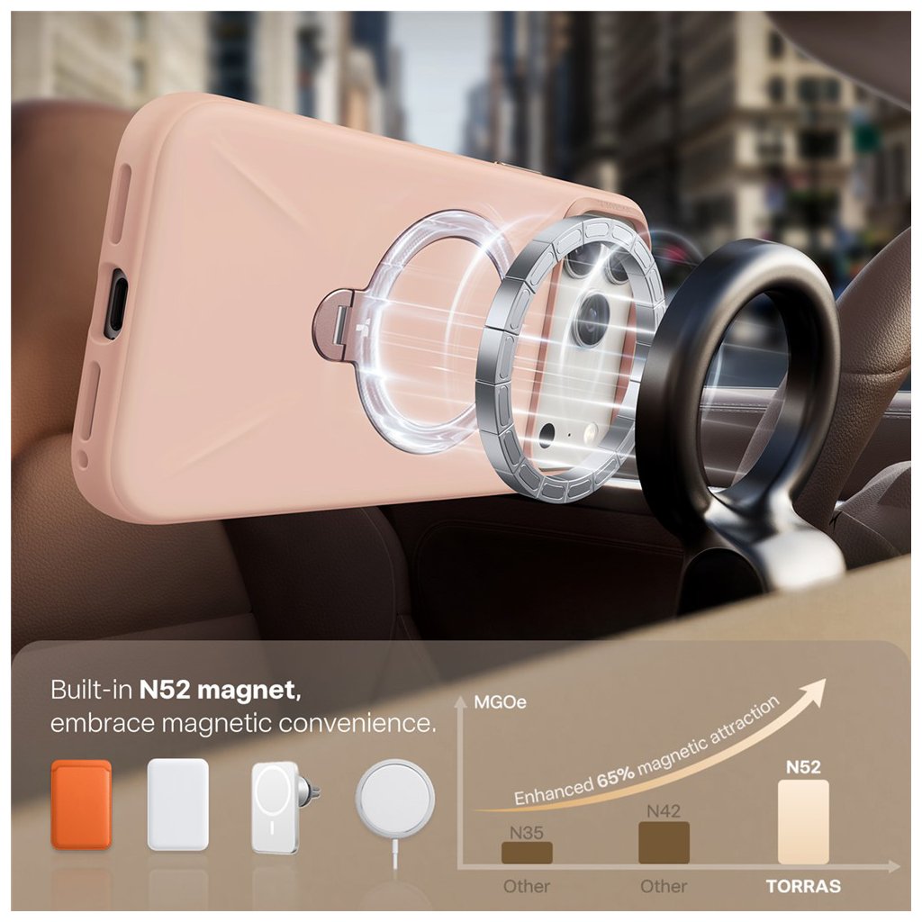 * **Kompatibilita:** Exkluzívne navrhnuté pre **iPhone 17 Pro Max**. * **Materiál:** Vyrobený z **vysokokvalitného tekutého silikónu**, ktorý zaručuje mäkký a príjemný pocit na dotyk. * **Vnútorná Podšívka:** Jemná podšívka z **mikrosemišu** chráni zadnú stranu telefónu pred poškriabaním a dodáva luxusný vzhľad. * **Povrchová Úprava:** **Nano easy-clean povlak** pre ľahkú údržbu a odolnosť voči nečistotám. * **Integrovaný Krúžok/Stojan:** * Otočný stojan s rozsahom **360°**. * Umožňuje stabilné polohovanie telefónu v uhle **0-180°** pre pohodlné sledovanie obsahu. * Poskytuje **bezpečnejší úchop** telefónu. * **MagSafe Kompatibilita:** Vybavený vstavaným **magnetom N52** pre silnejšiu magnetickú príťažlivosť a plnú kompatibilitu s príslušenstvom MagSafe. * **Ochrana:** * **Štvorvrstvový nárazuvzdorný systém**. * **Zvýšené okraje** okolo fotoaparátu a displeja pre maximálnu ochranu. * **Certifikácia:** **RoHS certifikácia** zaručuje ekologickú šetrnosť produktu. * **Farba:** Elegantná **ružová**.O Značke Torras