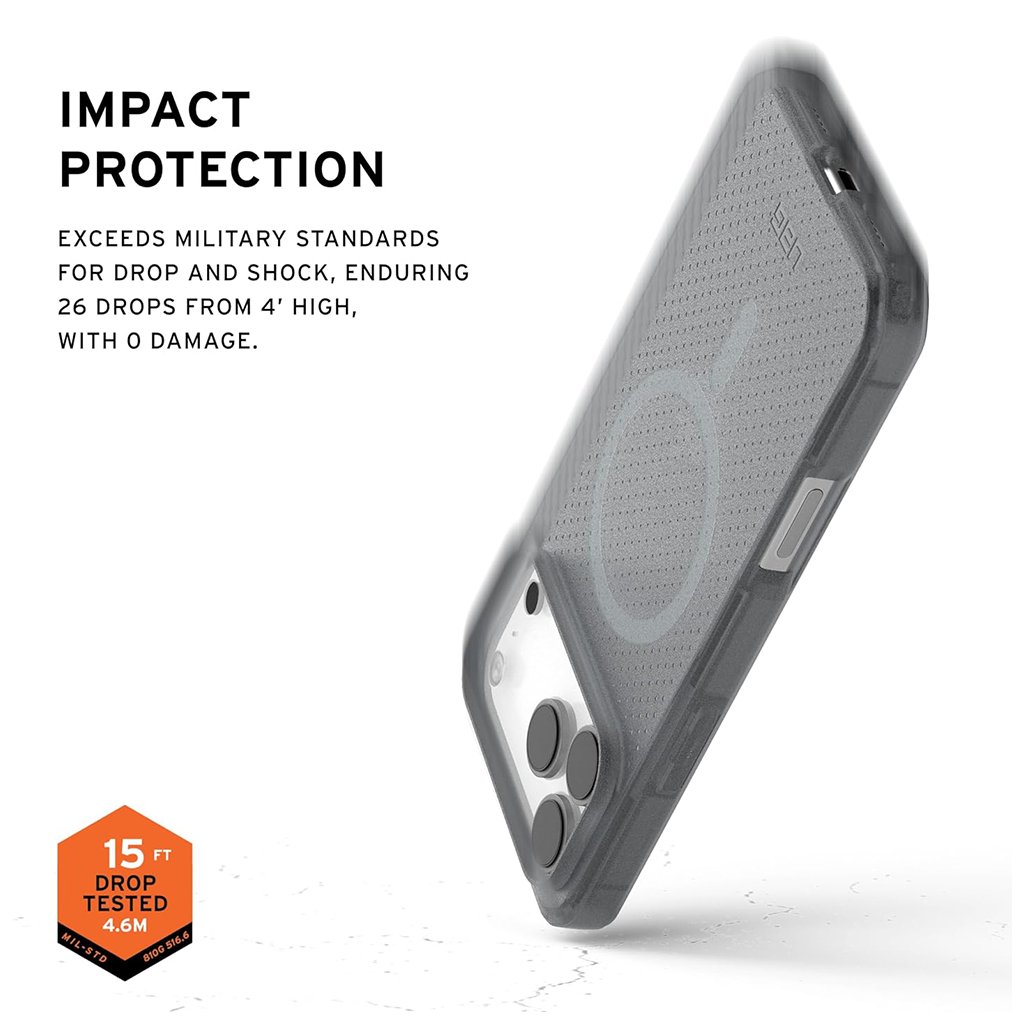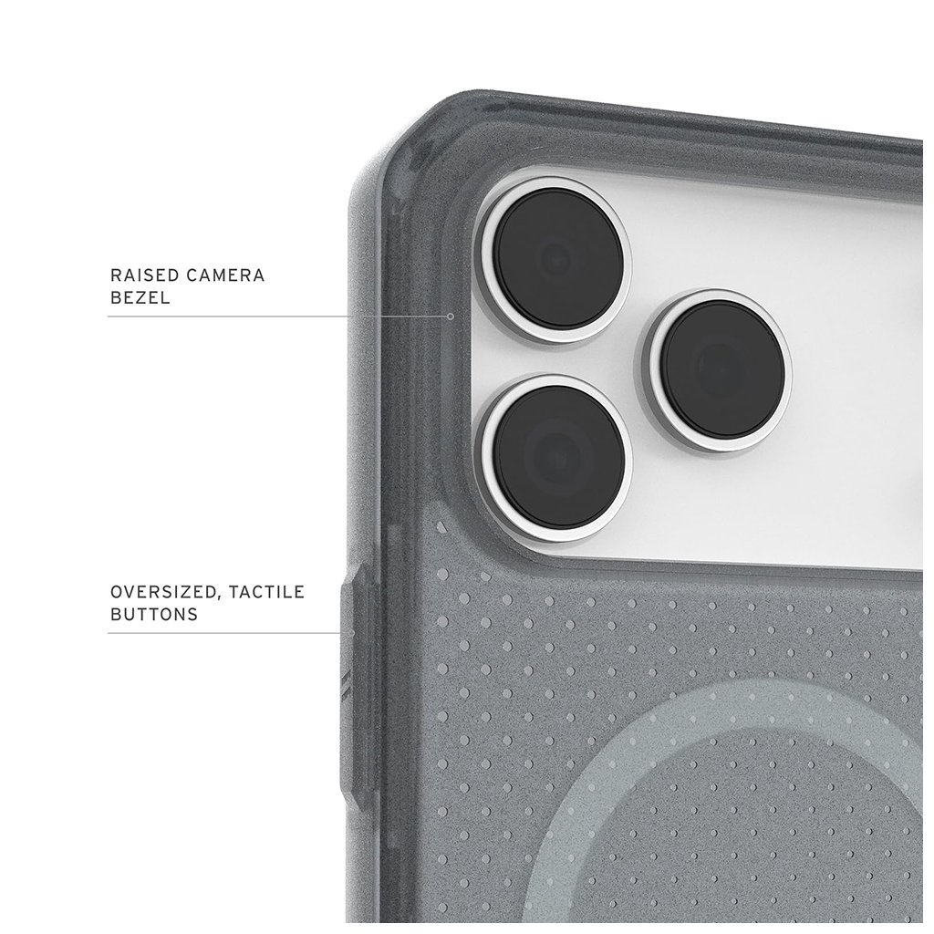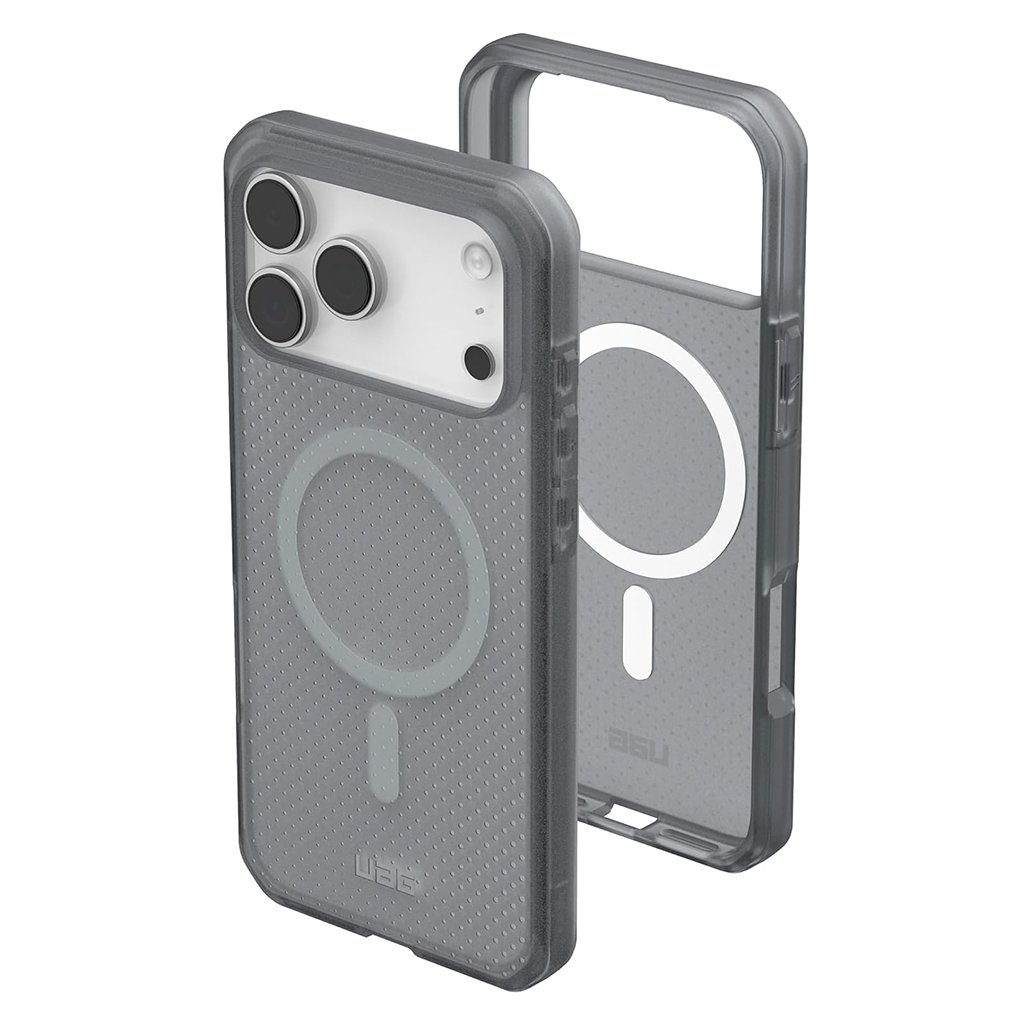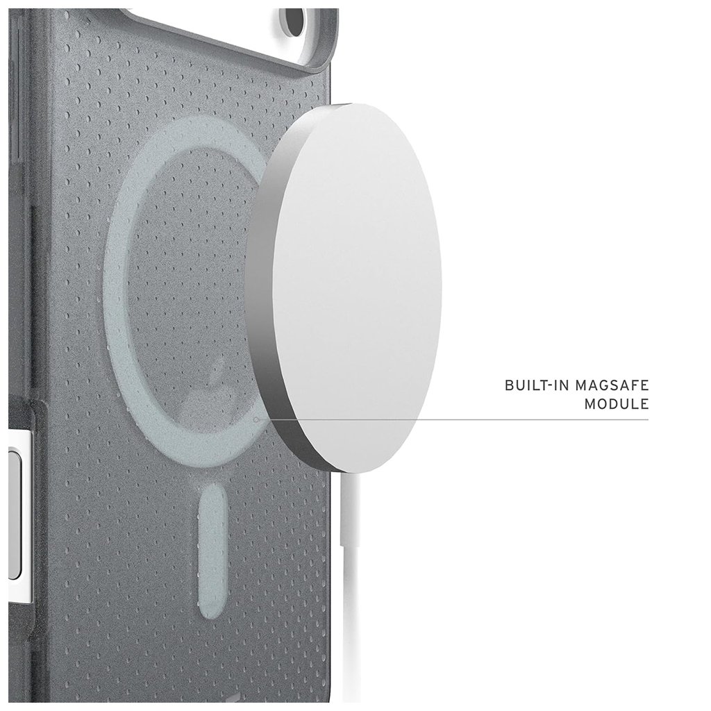 Kryt UAG Dot MagSafe sa vyznačuje priesvitným prevedením v popolavej farbe, ktoré necháva vyniknúť originálny dizajn vášho telefónu. Zadná strana je zdobená jemným bodkovaným vzorom, ktorý dodáva puzdru sofistikovaný a zároveň moderný vzhľad. Integrovaný MagSafe modul zaisťuje bezproblémovú kompatibilitu s MagSafe príslušenstvom a rýchle bezdrôtové nabíjanie.