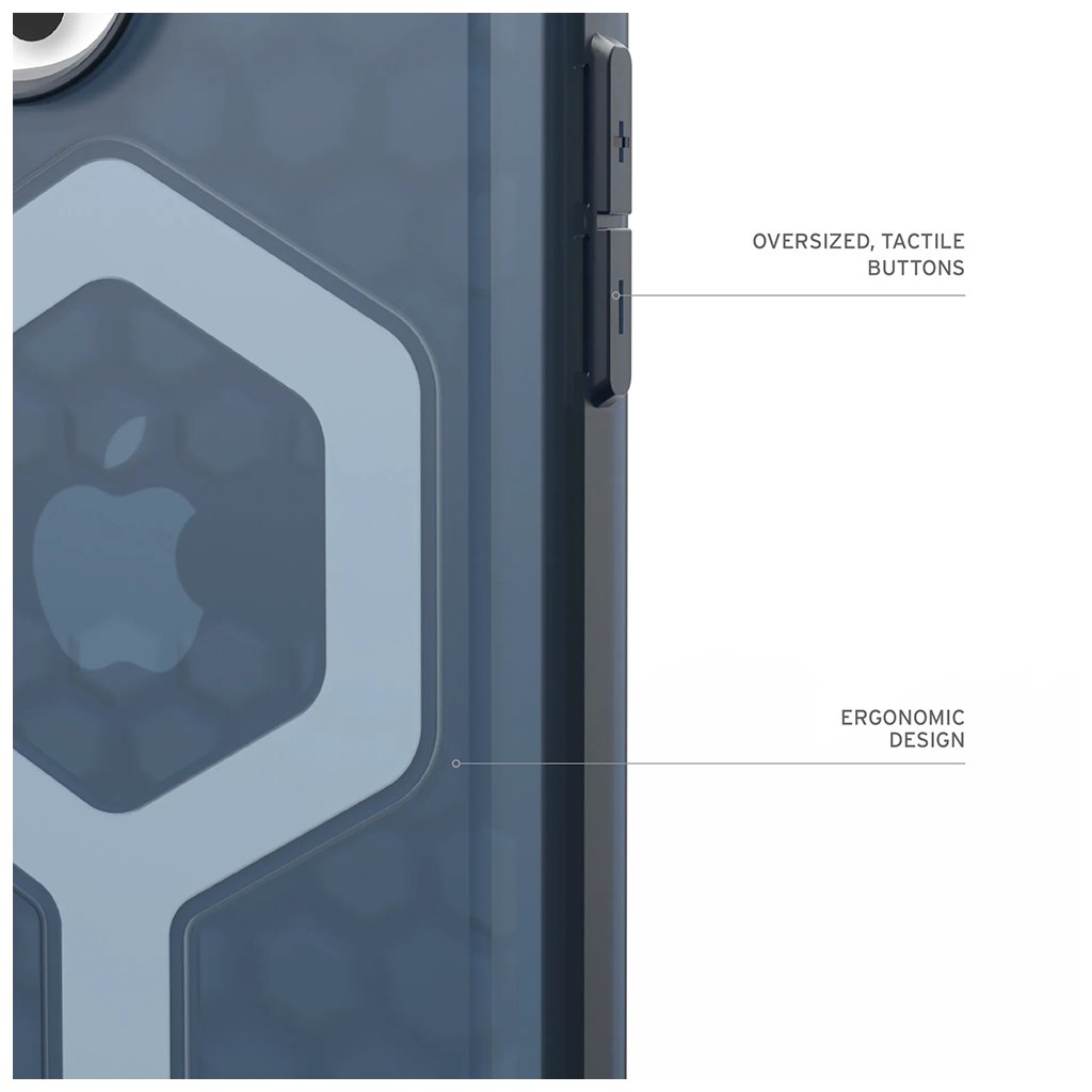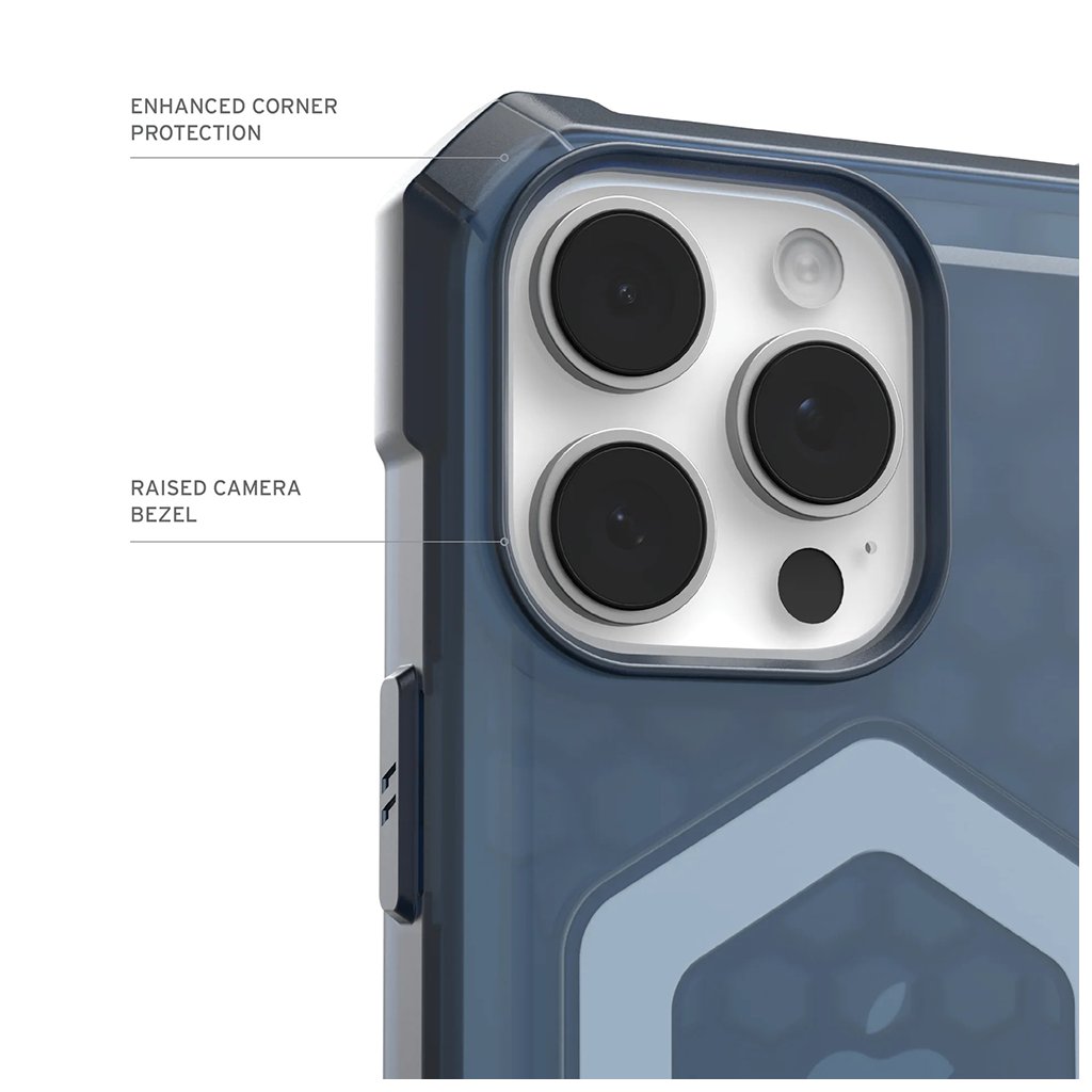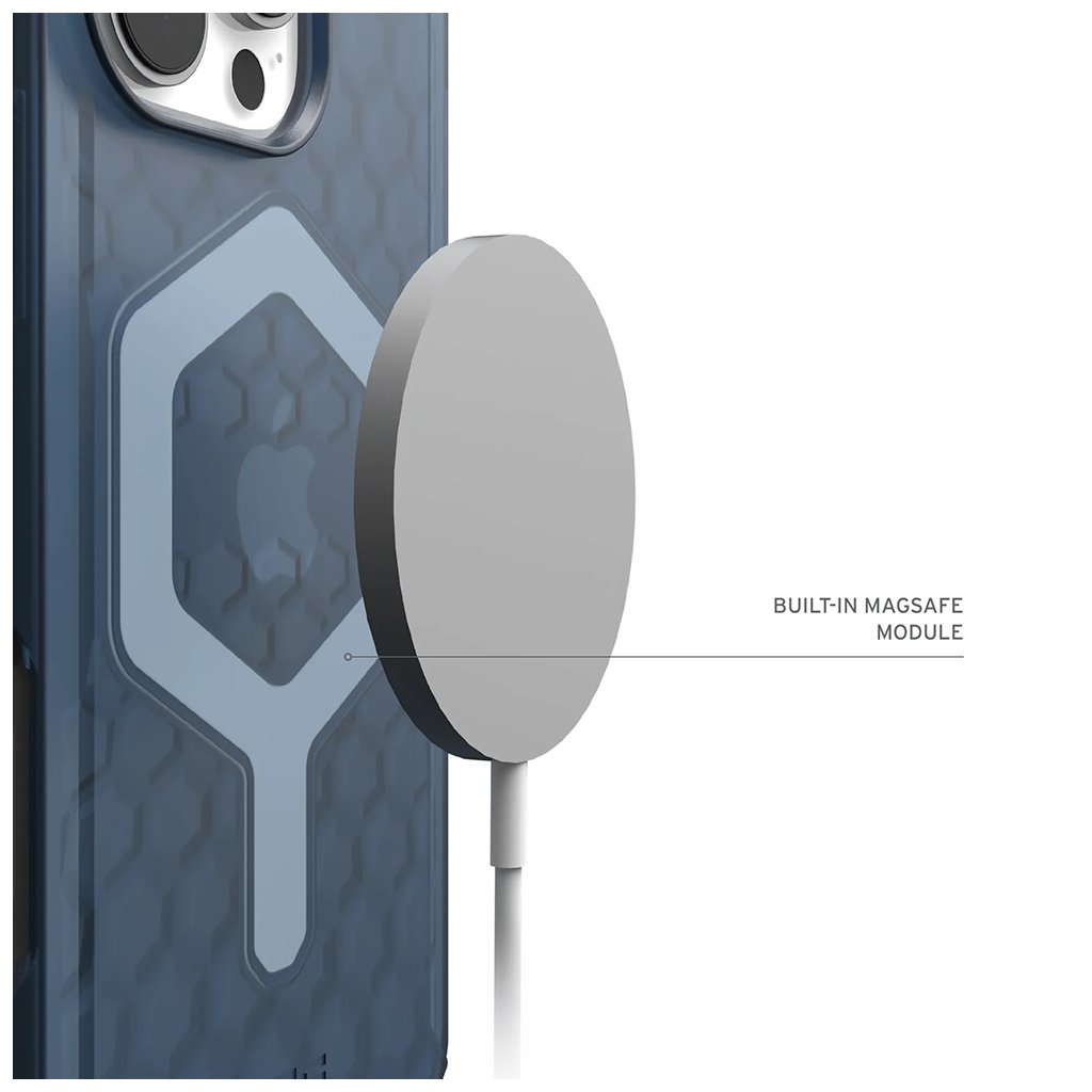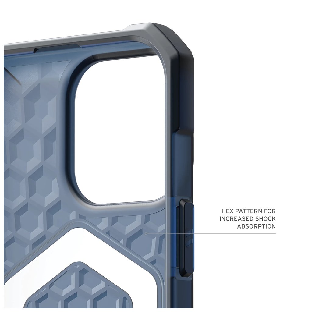 Kryt Essential Armor MagSafe sa pýši ikonickým industriálnym dizajnom UAG, ktorý kombinuje robustný vzhľad s prekvapivou ľahkosťou. Jeho priesvitné modré prevedenie "Cloud Blue" odhaľuje sofistikovanú šesťhrannú štruktúru na vnútornej strane, ktorá je kľúčová pre zvýšenú absorpciu nárazov a rozptýlenie energie pri páde. Puzdro je vyrobené z kombinácie tvrdej vonkajšej škrupiny (polykarbonát) a mäkkého, nárazy pohlcujúceho jadra (TPU), čo zaisťuje maximálnu ochranu. Zosilnené rohy a zvýšený okraj okolo fotoaparátu poskytujú dodatočnú ochranu proti poškriabaniu a pádom.
