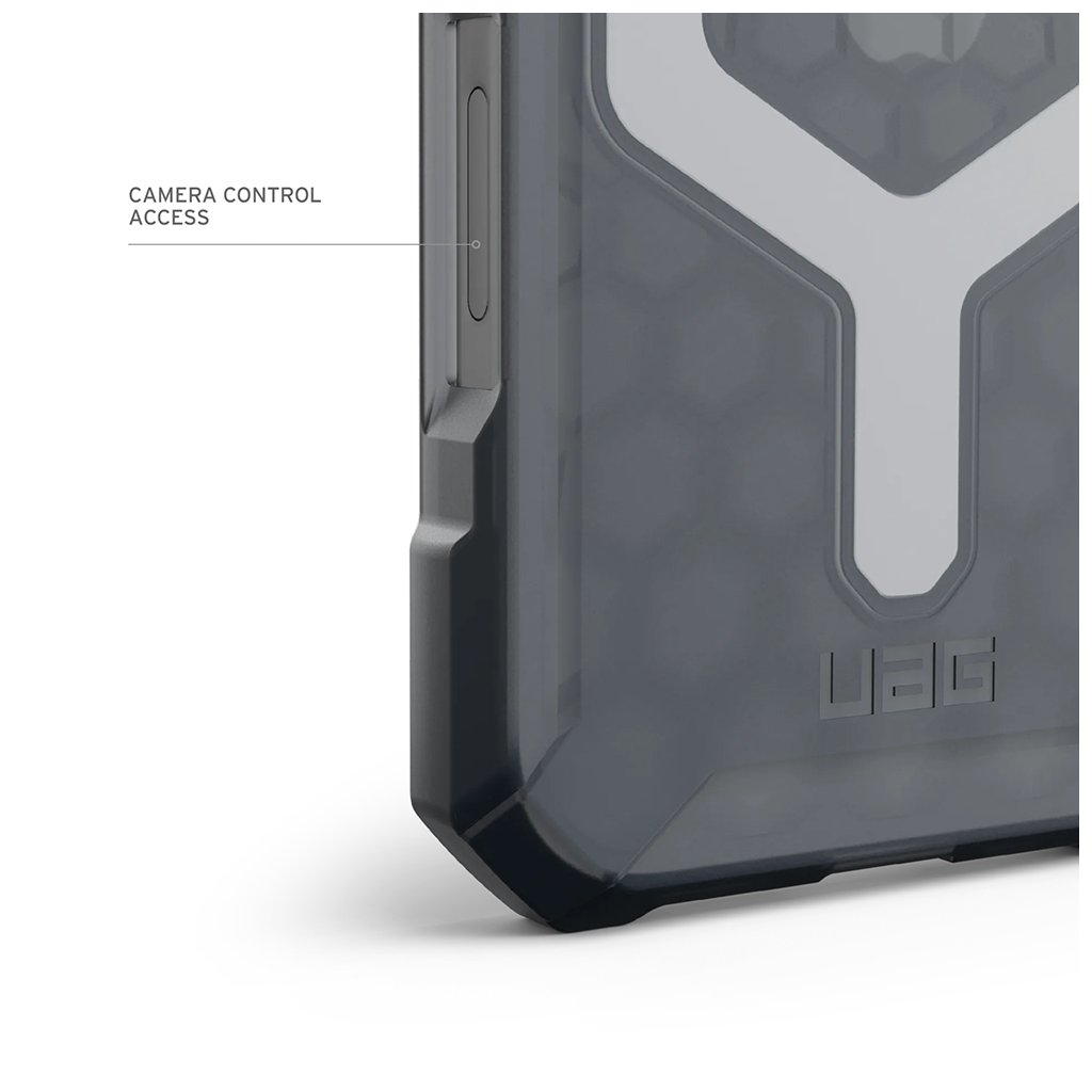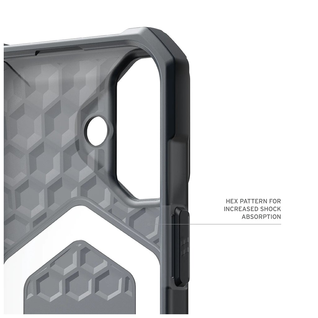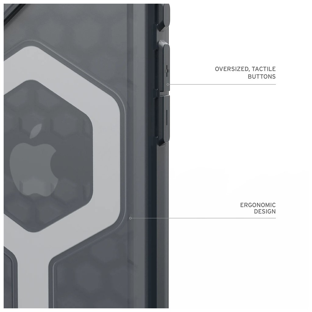 Dizajn krytu v popelavej farbe je elegantný a funkčný. Zadná strana je opatrená hexagonálnym vzorom pre zvýšenú absorpciu nárazov a výrazným šesťhranným prvkom, ktorý elegantne zvýrazňuje logo Apple a modul MagSafe. Zvýšené okraje okolo displeja a zvýšený rámček okolo fotoaparátu poskytujú dodatočnú ochranu proti poškriabaniu. Zosilnené rohy efektívne rozptyľujú energiu pri pádoch, zatiaľ čo nadrozmerné, hmatové tlačidlá zaisťujú jednoduché ovládanie. Celkový ergonomický dizajn a prístup k ovládaniu fotoaparátu podčiarkujú premyslenosť každého detailu.