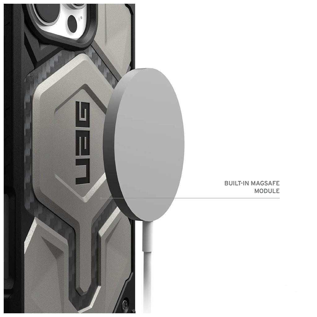 Kryt Monarch Pro je vlajkovou loďou značky UAG a ponúka **5 vrstiev ochrany**, ktoré výrazne prekračujú prísne vojenské normy odolnosti proti pádu (MIL-STD 810G). Kombinuje tvrdú vonkajšiu škrupinu z polykarbonátu s mäkkým, nárazy pohlcujúcim jadrom z TPU. V titanovom variante sa snúbi robustný čierny rám s výraznými titanovo sivými prvkami a textúrou pripomínajúcou karbónové vlákna na zadnej strane. Centrálne hexagonálne logo UAG dodáva krytu ikonický industriálny vzhľad.Funkčnosť v každom detaile